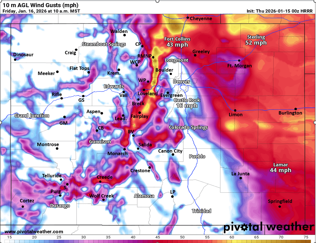 But the strongest wind on Friday will be over the northeast plains (east of a Greeley to DIA line) and also closer to Ft. Collins / WY Border, especially from 12pm-8pm on Fri: northwest wind-gusts of 30-60mph. Less wind for Den/Bou proper (gust likely under 40mph on Fri but breezy).