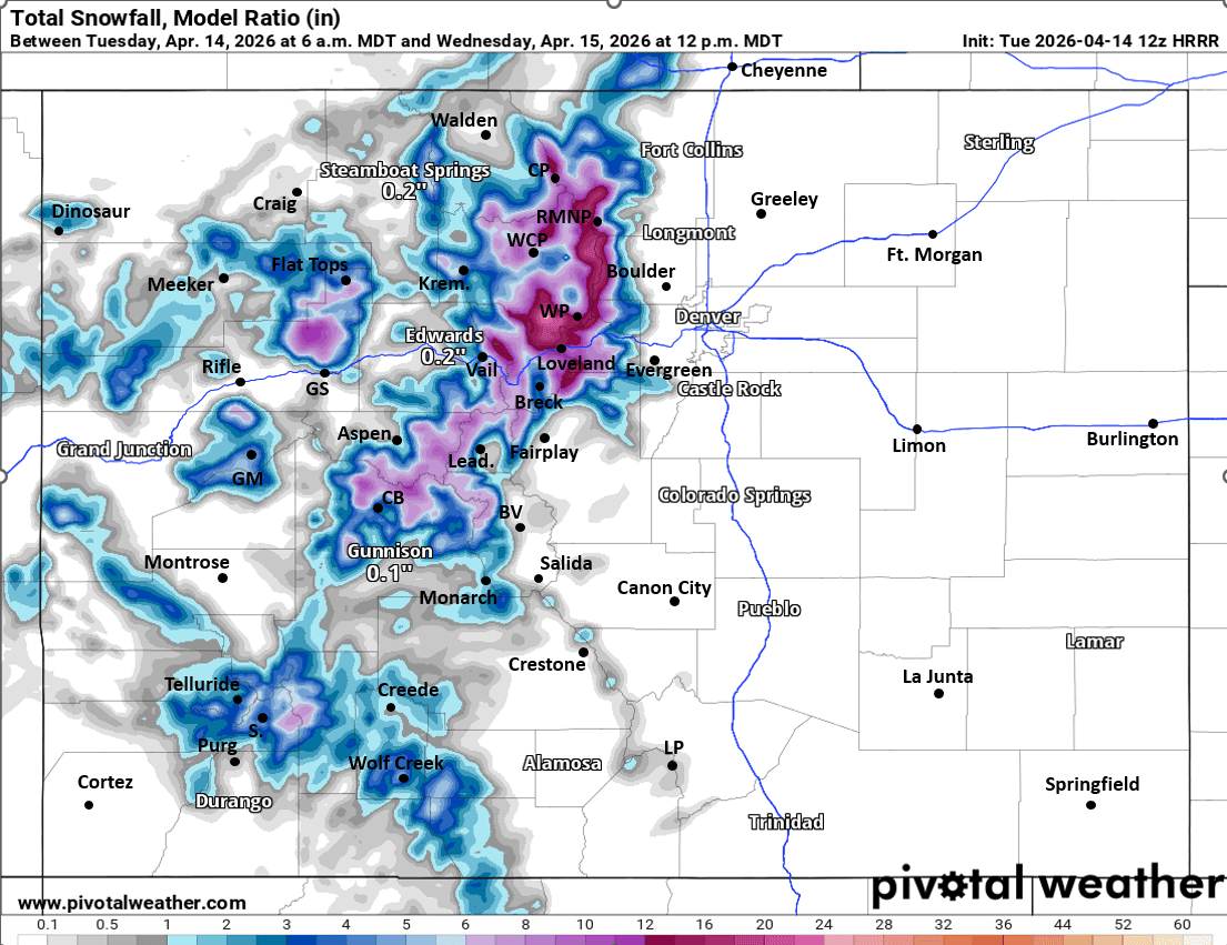 On the loop you can see that most of the heavier precip for the mountains will be from 2pm today through 2am Wed with a focus for heaviest snow near the Cont. Divide, around Loveland Pass / ski area, Jones and Berthoud Passes, Winter Park, parts of the IPW and RMNP (10"+ for some of those areas). Lesser amounts further west.