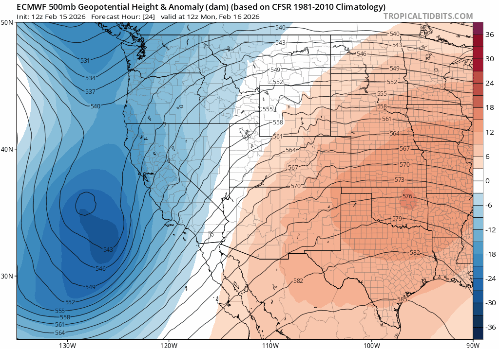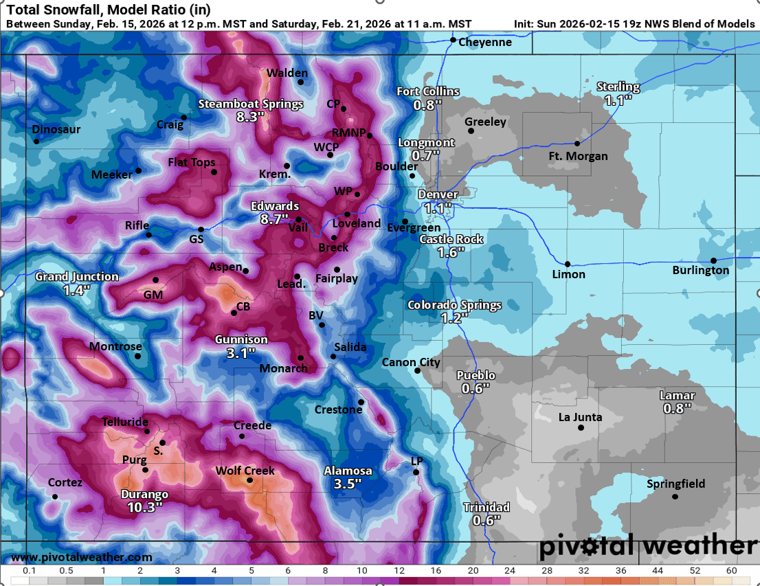 02/15/26 5:30pm: Hi, I hope you are having a good Sunday! You ready for some heavier snow in the mountains!? Its coming. Lets take a look at what we can expect this week as its shaping up to be a very active week weather-wise that will likely boost the state snowpack in many areas. And maybe bring some rain/snow to Den/Bou and the front-range (but likely not much there, mostly wind).