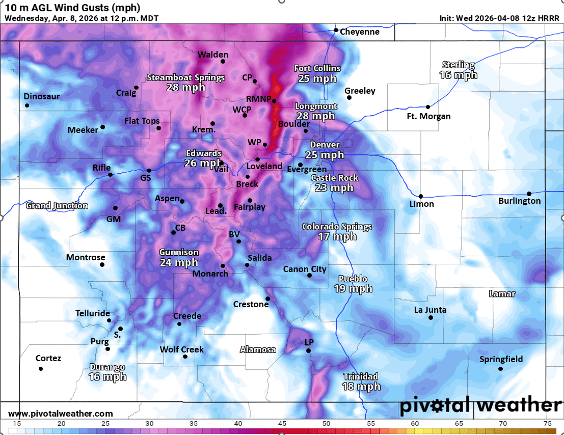But for today we are looking at windy conditions developing across the northern front-range from 11am-6pm: westerly wind-gusts of 25-50 mph, strongest in the foothills and front-range mountains above 8k ft (favoring Boulder and Larimer counties). Less further south and east towards Denver.
