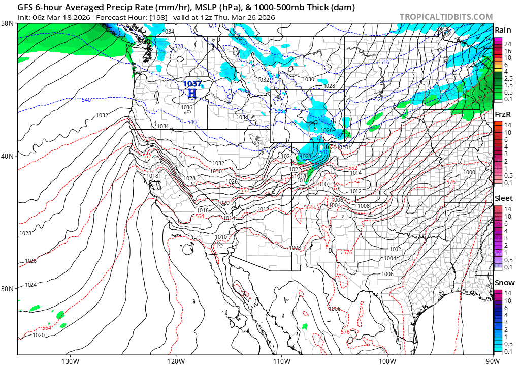 Then maybe a northwest flow clipper for the mountains late Wed into Thu next week (03/25-03/26) and that could bring several inches of snow to the mountains, but details are uncertain. Image 4 shows forecast precip-type / rate next Thu (03/26) at 6am from GFS.