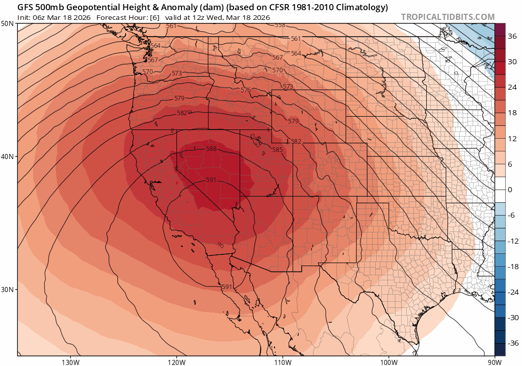 First loop shows the upper-level pattern over the next 15 days via 500mb height anomalies from latest GFS...you can see the very strong / hot area of high-pressure from now through Sat, a cool-down / weak cold-front on Sun, then back to very warm air for Mon-Wed next week. Then maybe a more substantial and colder storm system for the mountains by next Thu (03/26), but that is a ways out.