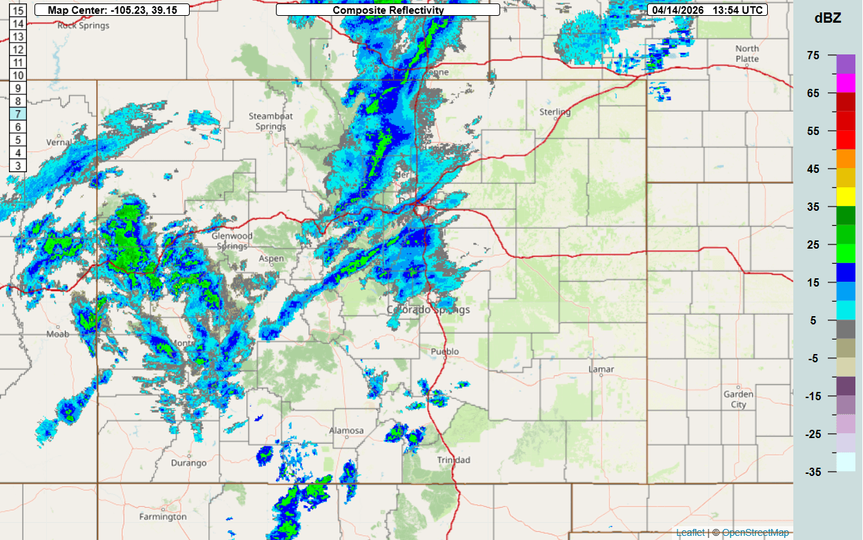 04/14/26 8am: Morning. The current storm system is moving into CO now with some rain/snow showers in the mountains and few weak rain showers developing near the front-range now. You can see this on the current radar below (image 3).