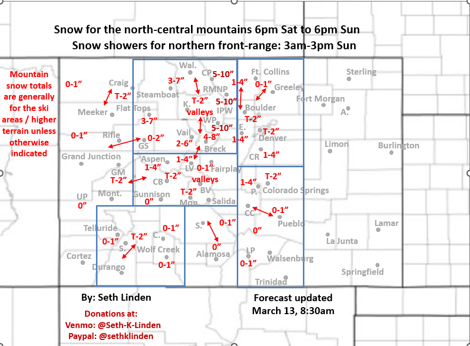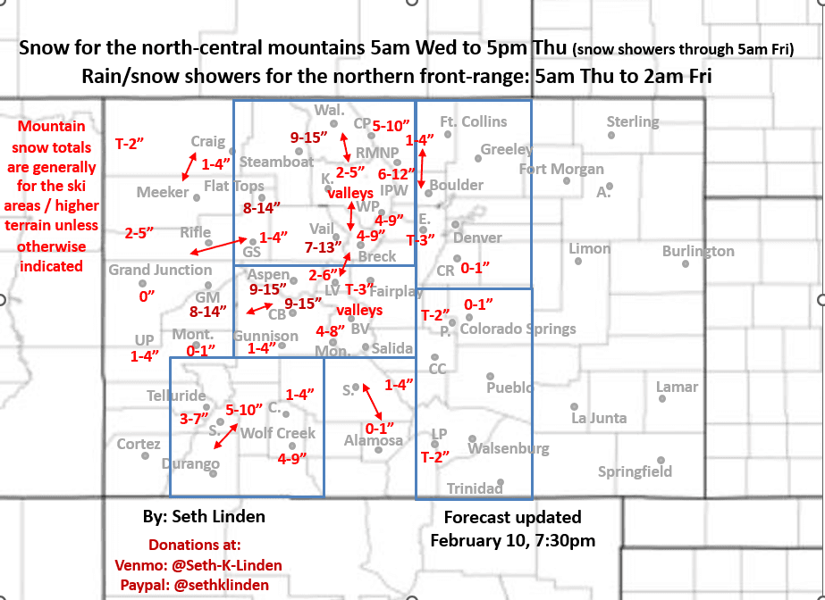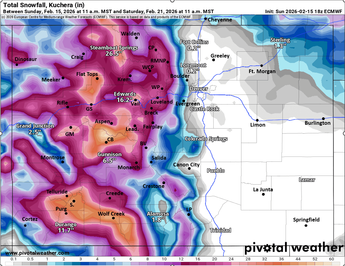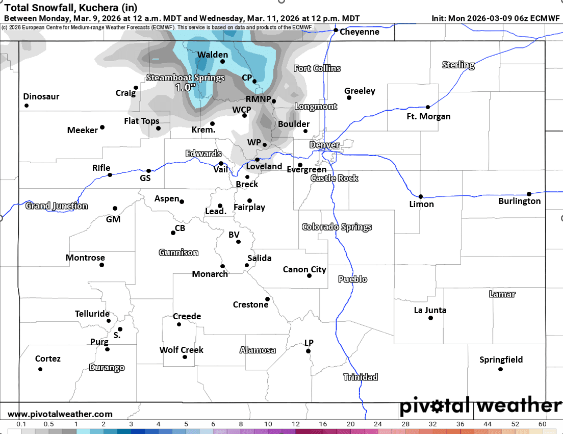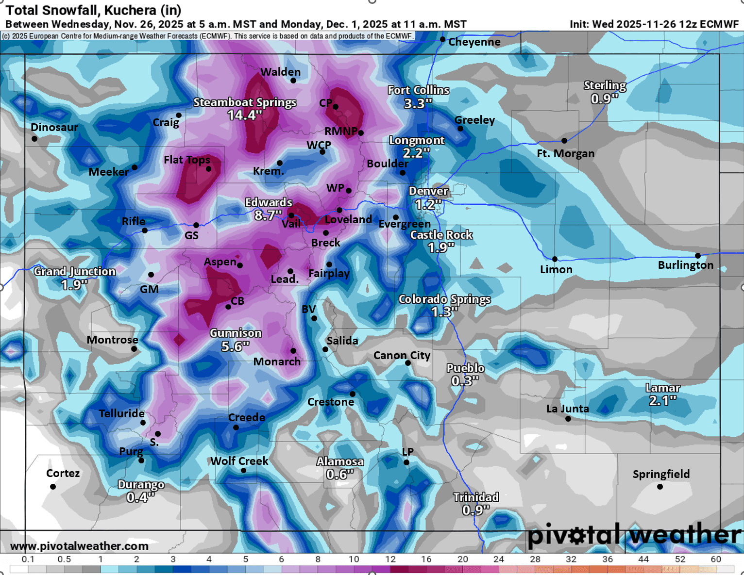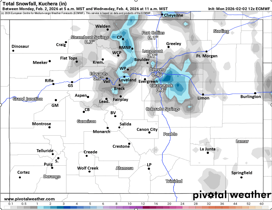 Wed-Thu storm looking stronger for Den/Bou, latest snowfall map