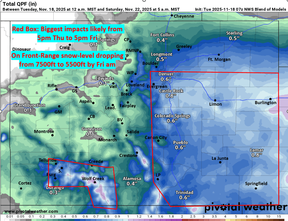 A quick look at the Thu/Fri storm system: rain more likely than snow for Den/Bou, more snow for the mountains