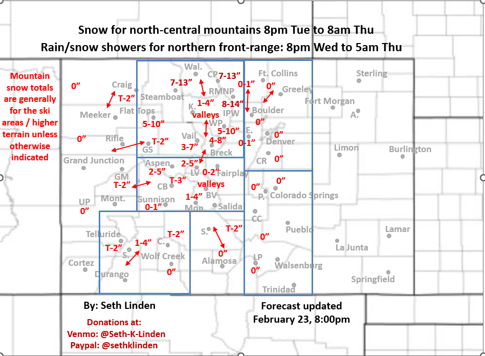 Forecast for the week of 02/22 to 03/01. More snow for the mountains Tue pm to Thu am