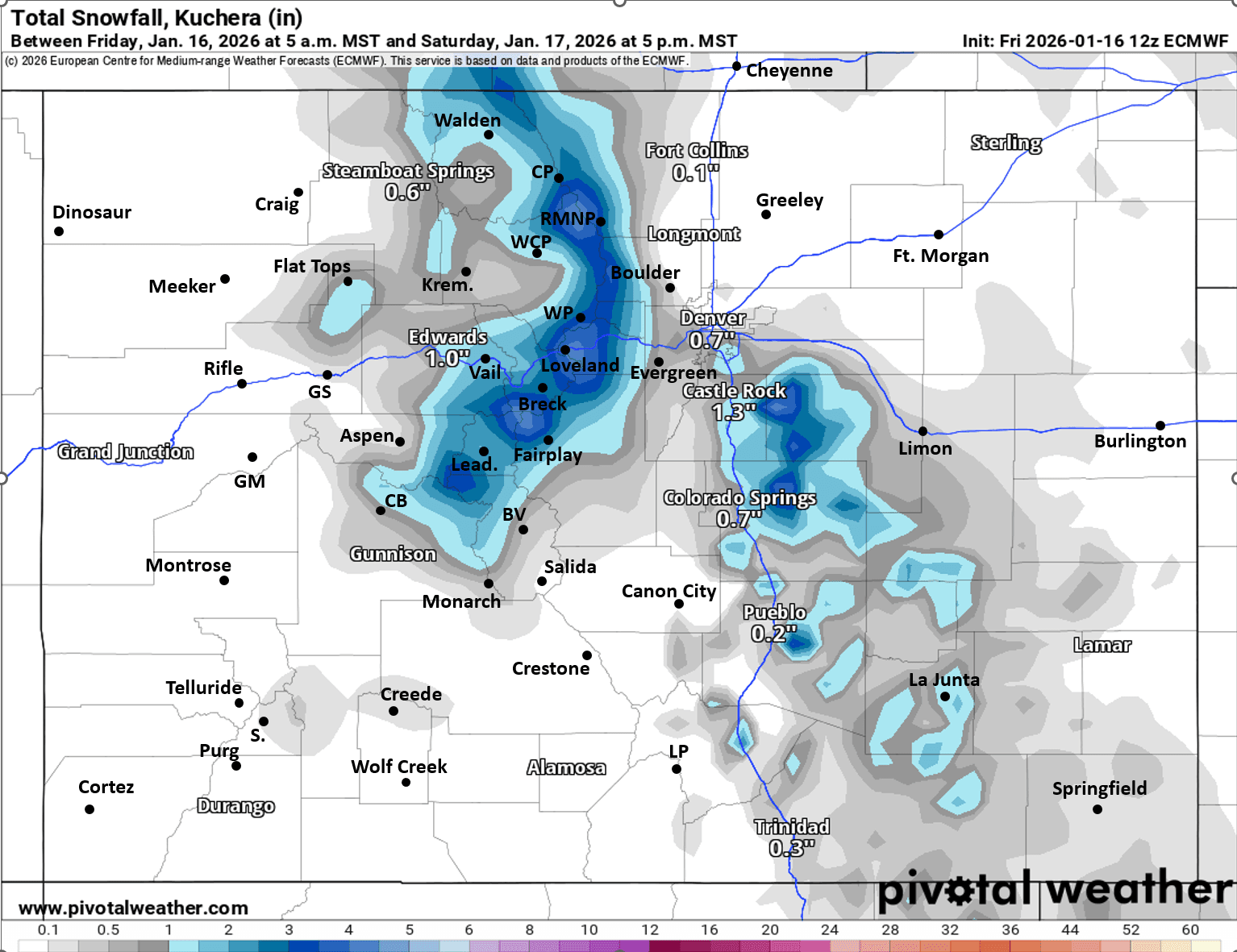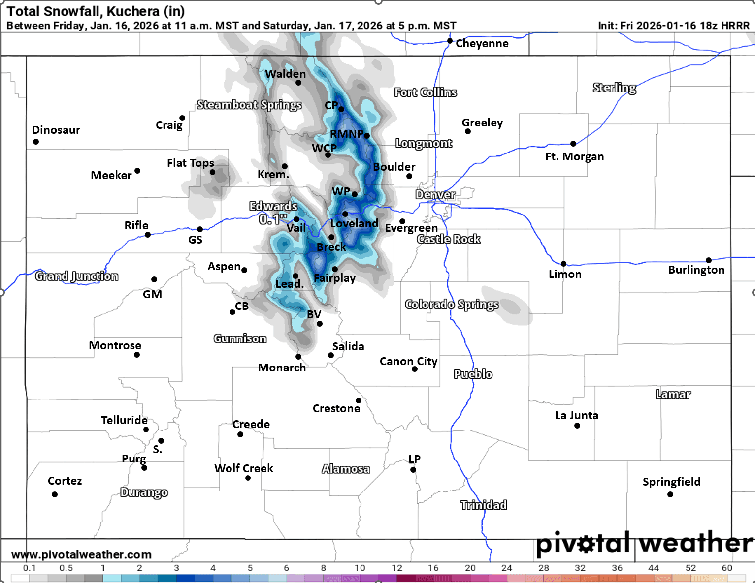For areas closer to Vail, Beaver Creek, Steamboat ski area, Leadville and maybe Aspen ski areas: Trace-2" by Sat mid-day