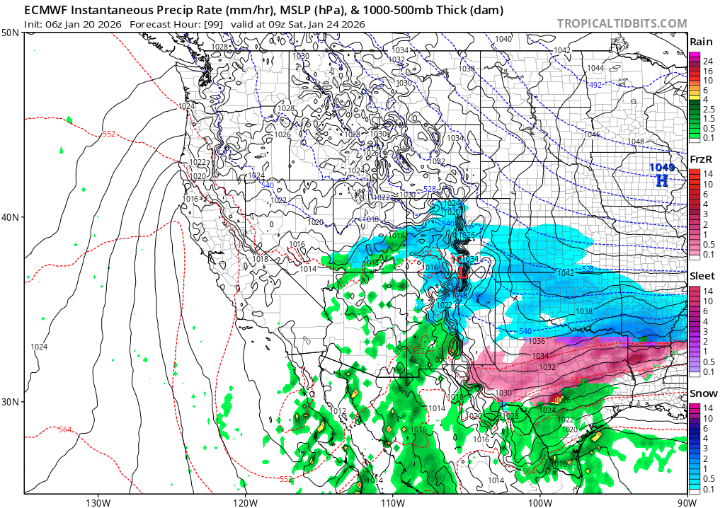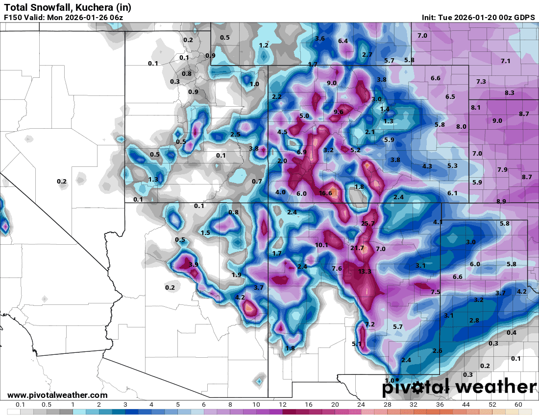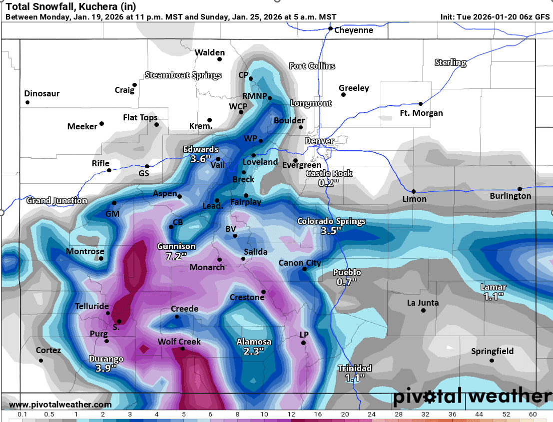 01/20/26 8:30am: Morning, its Tuesday lol. As I mentioned yesterday we have a complicated forecast setting up for Friday to Sunday and the details are very uncertain. Models show a southern branch upper-level low combining with a northern branch trough with some colder air and deep pacific moisture (and even a shot of upslope for the front-range). Big questions on how far south the overall setup is on Fri night into Sat and that will determine snow amounts especially in northern CO.