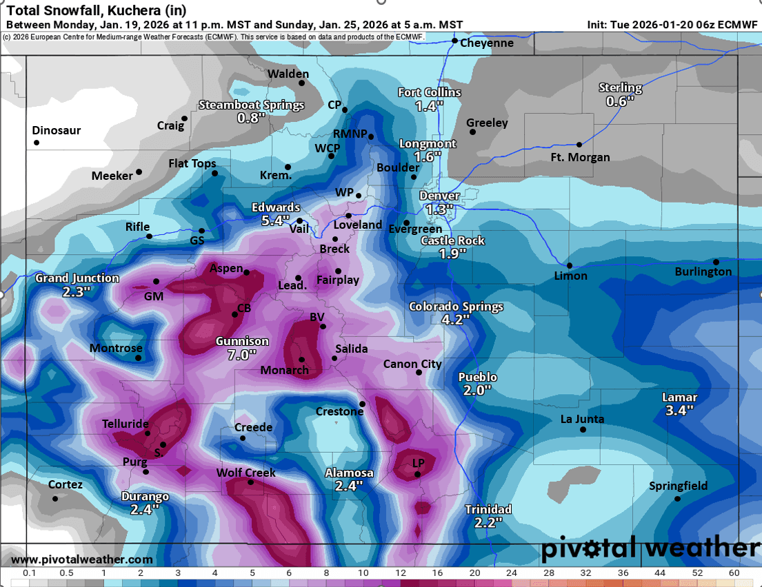 ECMWF and GEM models have the setup farther north with good snowfall for north-central CO (and southern CO). GFS has the setup further south with most of the meaningful snow over southern CO and very little for Den/Bou and the front-range (some for the mountains).