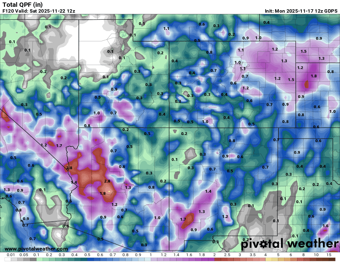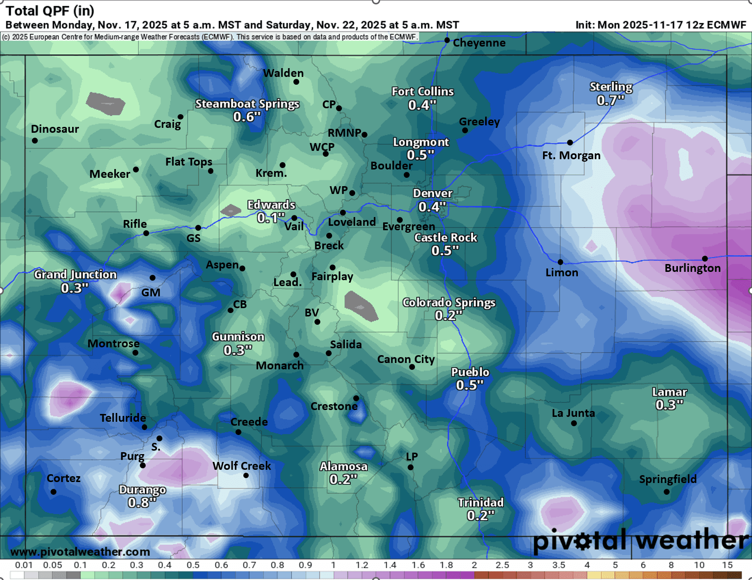 11/17/25 12:30pm: I know we are all anxious on the front-range for a big storm and first snowfall but that may not happen with the Thu/Fri storm system. I'm seeing high uncertainty in the models in regards to the track and strength of the upper-level low, also where it will undergo cyclogensis and strengthen. Its a complex flow pattern and a relatively warm storm system (for this time of year).
