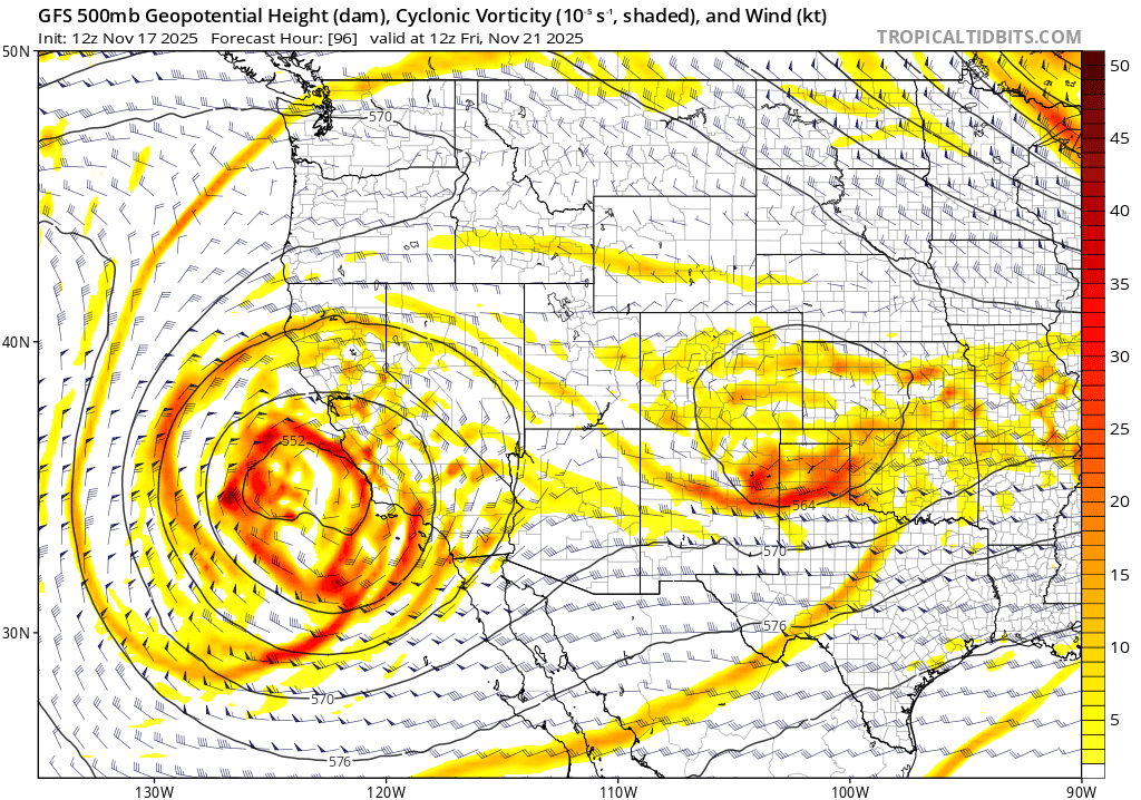 First image shows the upper-level low at 5am Fri via 500mb vorticity / wind from latest GFS (its too far southeast). Image 2-5 compare forecast liquid precip from now through 5am Sat (11/22) from ECMWF, GFS, ICON and GEM (regional view). Take amounts with grain of salt, and of course for the mountains all this precip will be snow (you can use a 12:1 ratio to estimate).