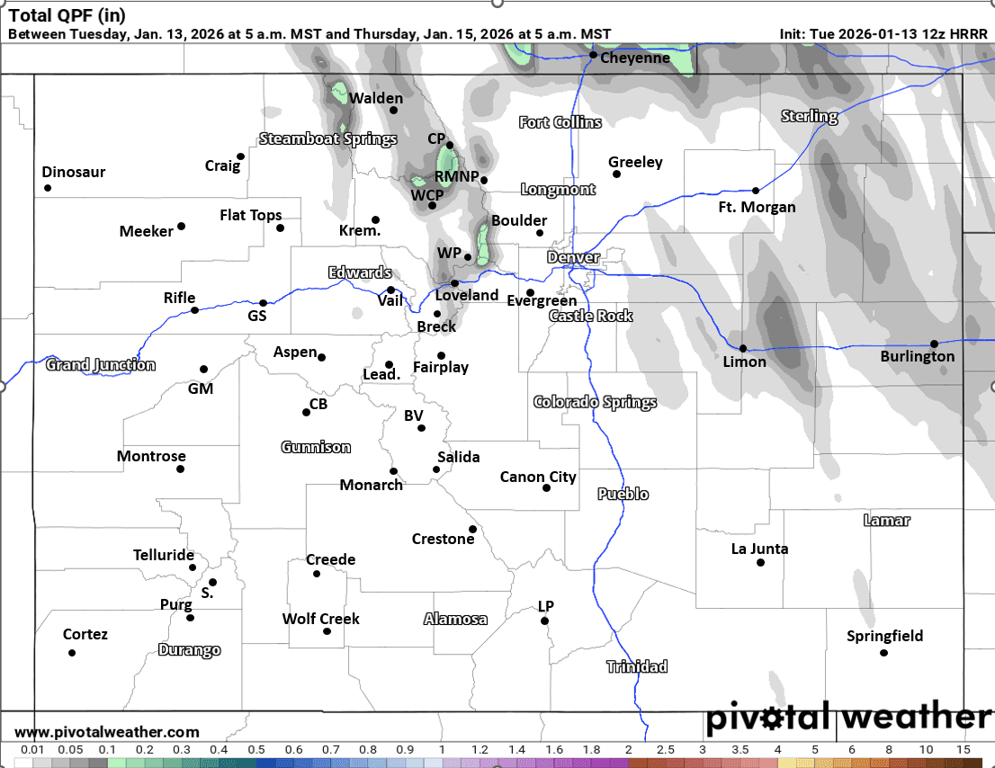 The northern front-range mountains will have a chance for some light snow / snow-showers from 12am-9am Wed. Favoring areas from near Loveland ski area north / east, across Berthoud Pass, IPW, RMNP, Cameron Pass areas, maybe parts of Park Range: Trace-2" in spots there. Not much west of the Tunnels.