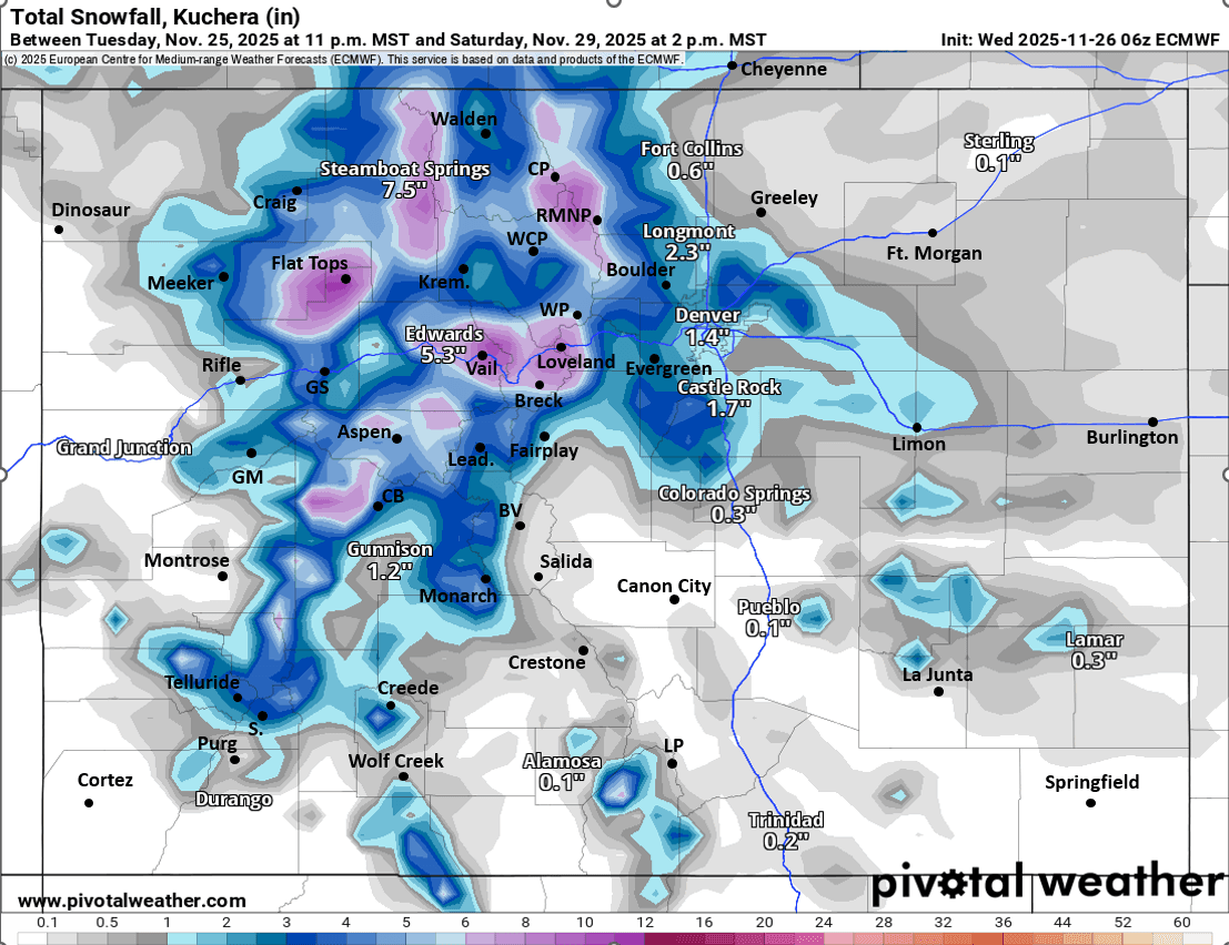 Looking ahead, models like ECMWF still show a nice little snow event on Friday night into Saturday morning (from 10pm Fri to 12pm Sat), with maybe 1-3" for Den/Bou. On the flip-side GFS is showing more downslope flow, less snow (and only Trace-2" for Den/Bou). If ECMWF verifies maybe 3-6" for the foothills as well with 4-8" for the north-central mountains. Uncertainty is high, whats new.