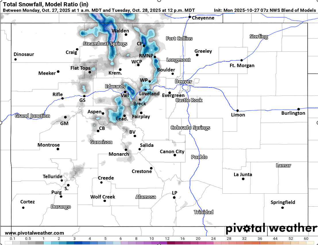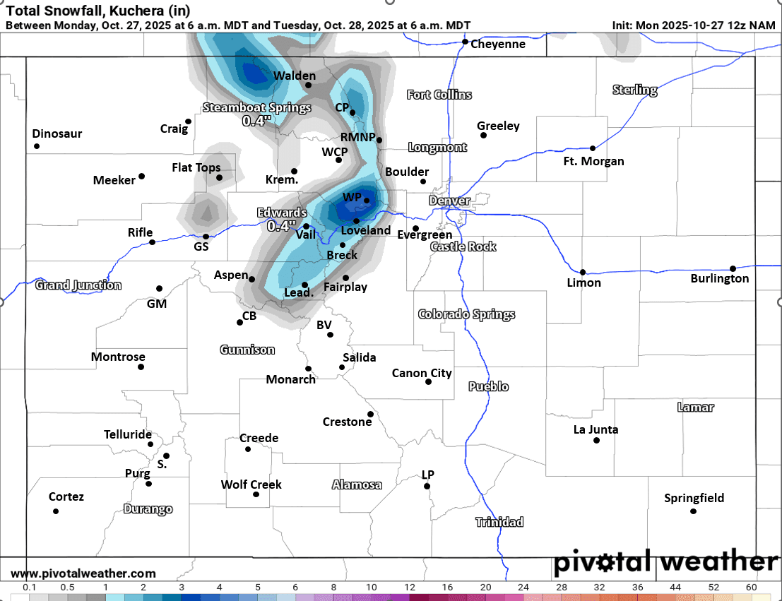Parts of the Park Range (north of Steamboat) and Medicine Bow Range (closer to Cameron Pass to RMNP) can expect 3-7" in spots.