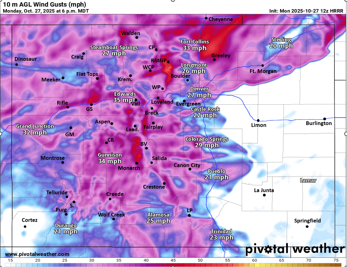 It will also be cold in the mountains on Tue with high temps only in the 20s (above 9k ft) with westerly wind gusts as well 20-40mph, especially along/east of the Cont. Divide on Tue (Front Range mountains) looks like full on winter in the mountains.