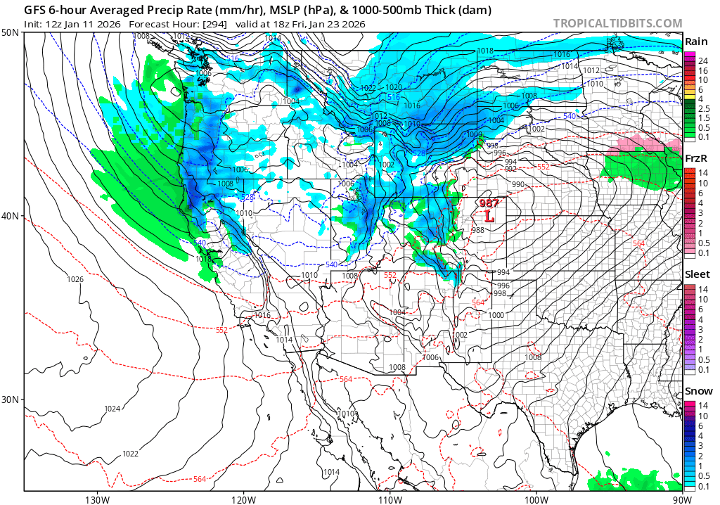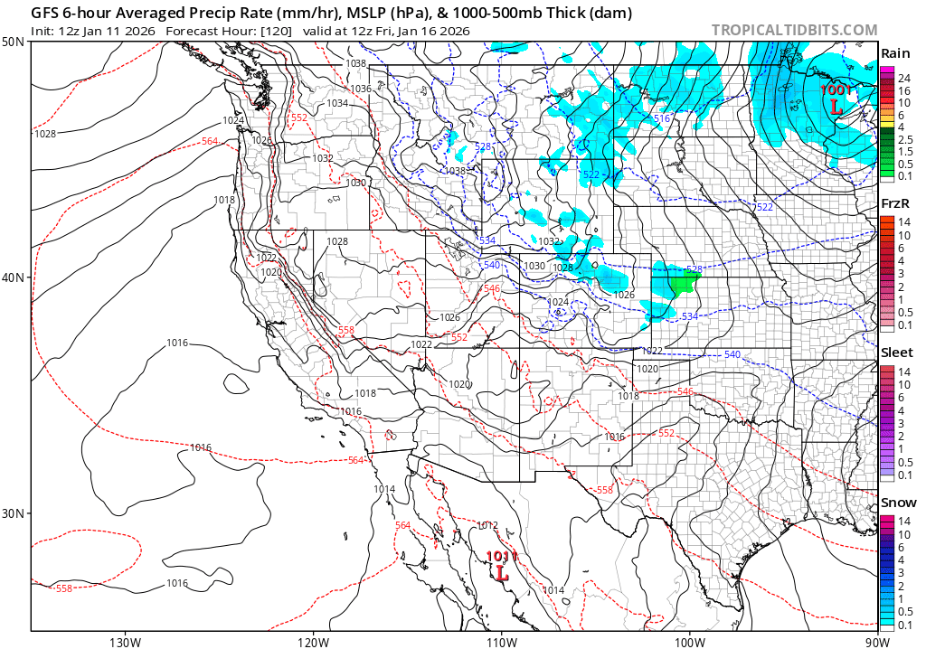 01/11/26 1:30pm: Hi, I hope you are having a good Sunday. Lets take a look at the weather pattern over the next 1-2 weeks. Initially over the next 10 days or so, a ridge of high pressure will dominate the weather across the western U.S. with a few intrusions of colder air (and maybe some light snow) impacting Colorado from the north / northeast, CO will be on the edge of the colder air at times).