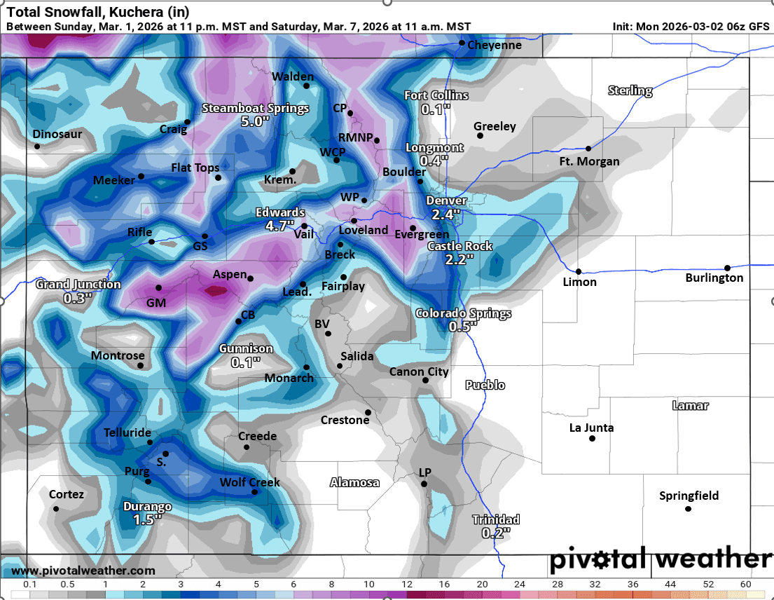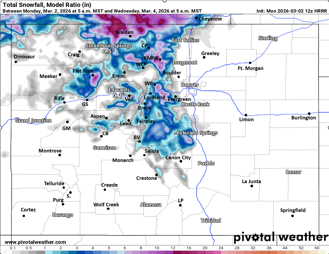 Heavier snow likely for parts of the Front Range mountains and northern mountains: IPW, RMNP to Cameron Pass areas: 2-6" by Wed am. Maybe similar for parts of the Park Range towards Walden as well.
