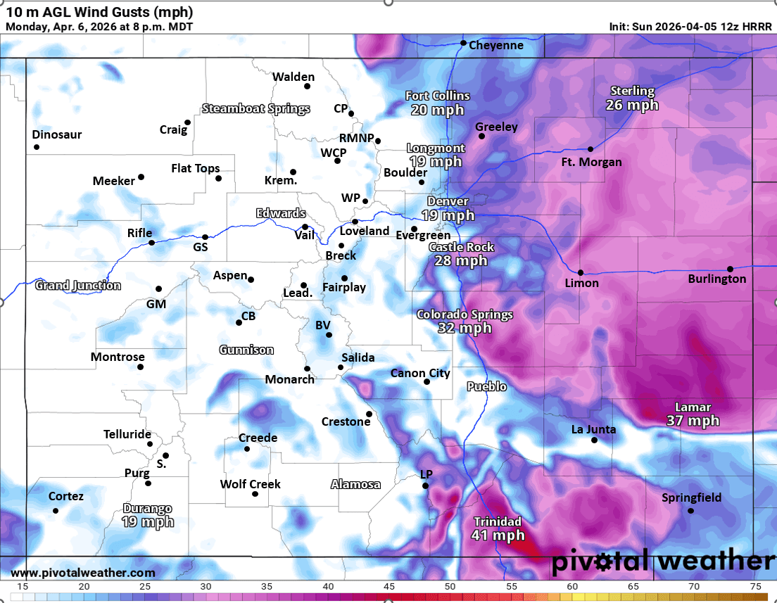 First image basically shows rain chances over the next 10 days via 24hr accumulated liquid precip from GFS....you can see the signals showing up for a wetter pattern towards next weekend and the following week (details need to be worked out). Image 2 shows the upper-level low at 12am Sun, big questions on where this thing tracks and impacts on CO. Third image shows forecast wind-gusts at 8pm Mon from latest HRRR (backdoor cold-front).