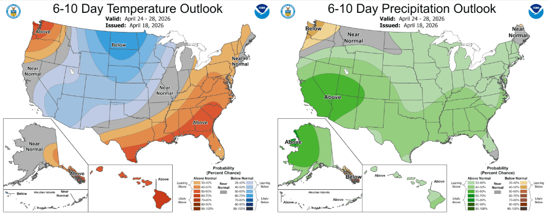 First image loop shows forecast precip-type / rate from latest 12z GFS from 6am Wed (04/22) through 6am Fri (05/01). Second image shows the super complex flow pattern at 6am Thu with 3 waves rotating around (high uncertainty). Image 3 shows the latest 6-10 day outlook from NCEP, showing the signals for a more active (wetter) and cooler pattern. Fingers crossed.