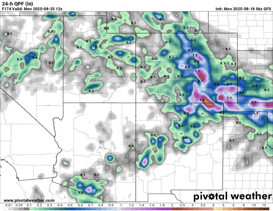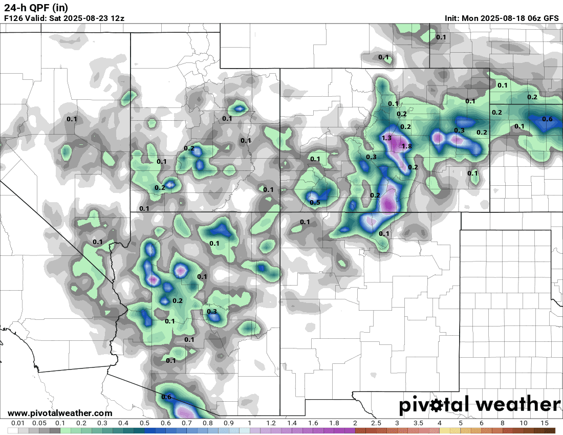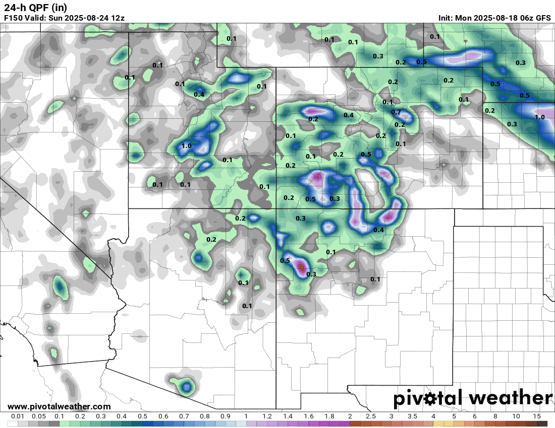 I see a more active pattern (in terms of better rainfall chances) with cooler temps overall from about this Friday, August 22nd through about Wed Aug 27th. Hard to pin down details but several cold-fronts for the front-range (starting this Thu night) and deeper / monsoon like moisture for the mountains (jet stream looks active as well).