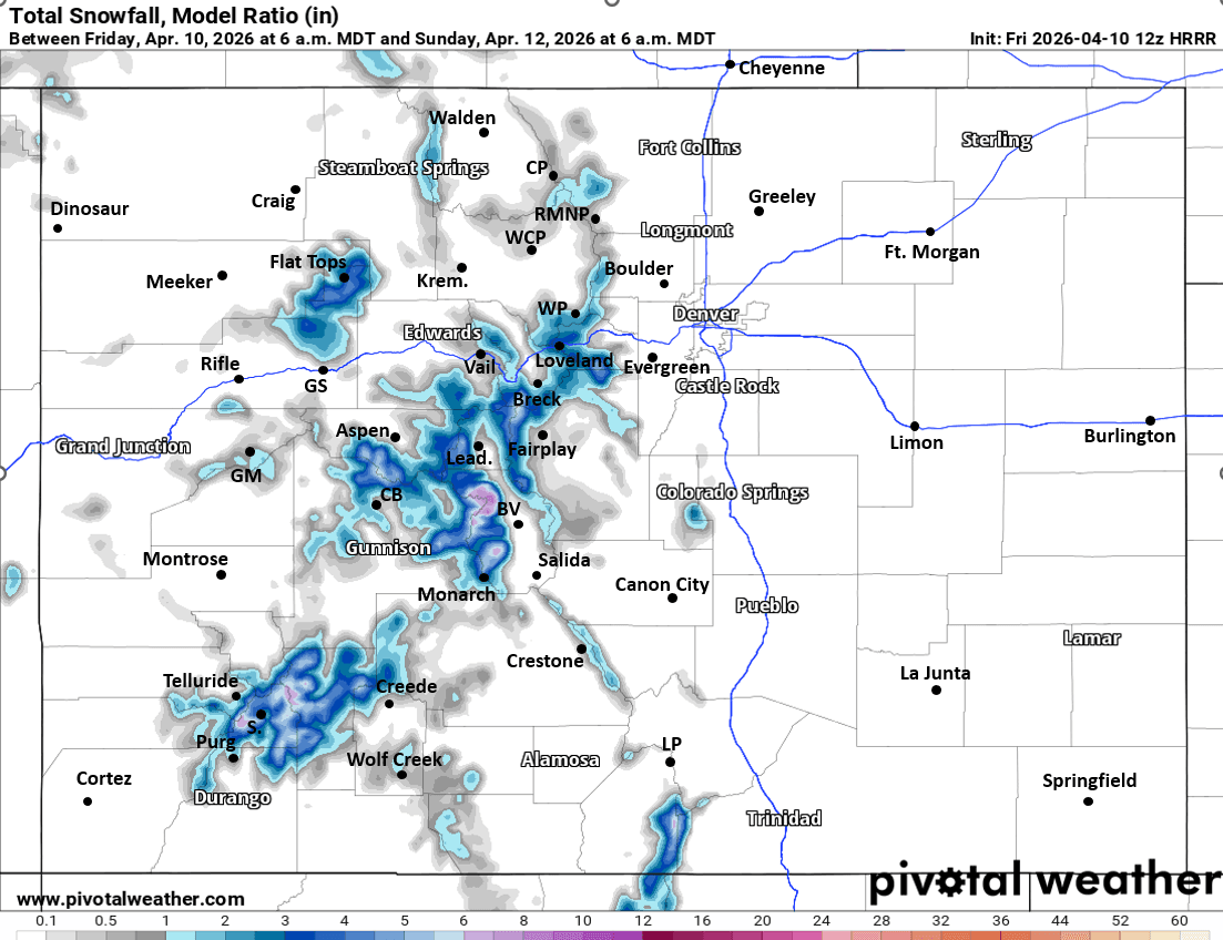 Best chances for heavier snow > 4" will be in upper parts of the San Juans, Elks and Collegiate Range (southern Sawatch).