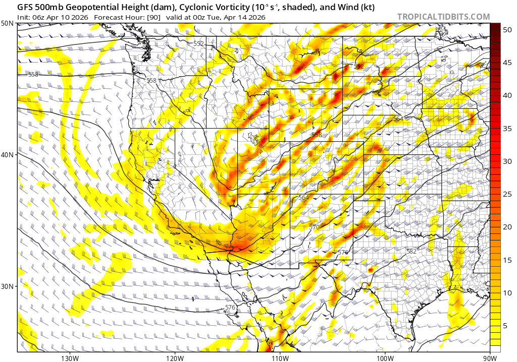 First image loop shows forecast radar over the next 48hrs (6am this morning through 6am Sun) from latest HRRR model. Images 2 and 3 show forecast total liquid precip and total snowfall from now through 6am Sun from latest HRRR, take with a big grain of salt, just shows where heavier precip will be possible. Image 4 shows the big, disorganized upper-level low on Mon afternoon via 500mb vorticity / wind from latest GFS.