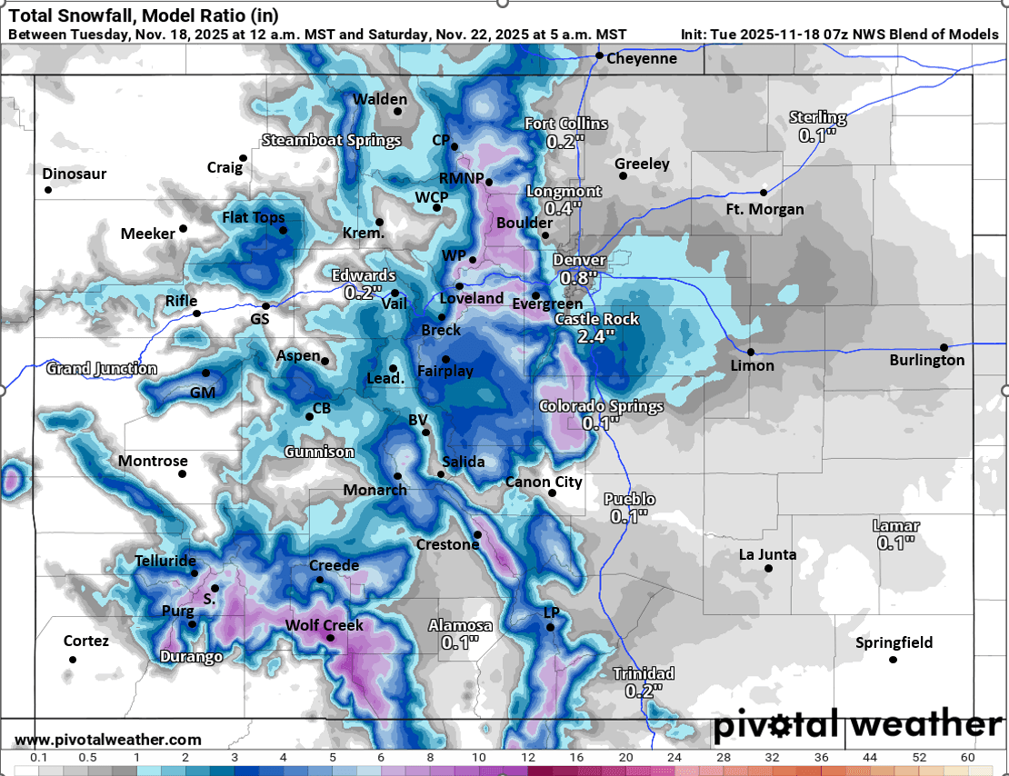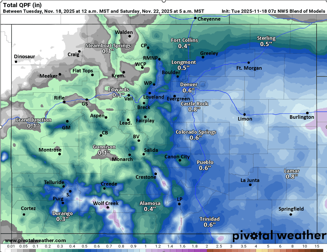 11/18/25 8:30am: Morning, we have some weather to talk about. We are still looking at a pretty impactful storm system (with much needed rainfall and some snow) for parts of the front-range and eastern CO on Thu into Fri (favoring southeast CO). Prior to this some snow for the western and southern mountains tonight into tomorrow.