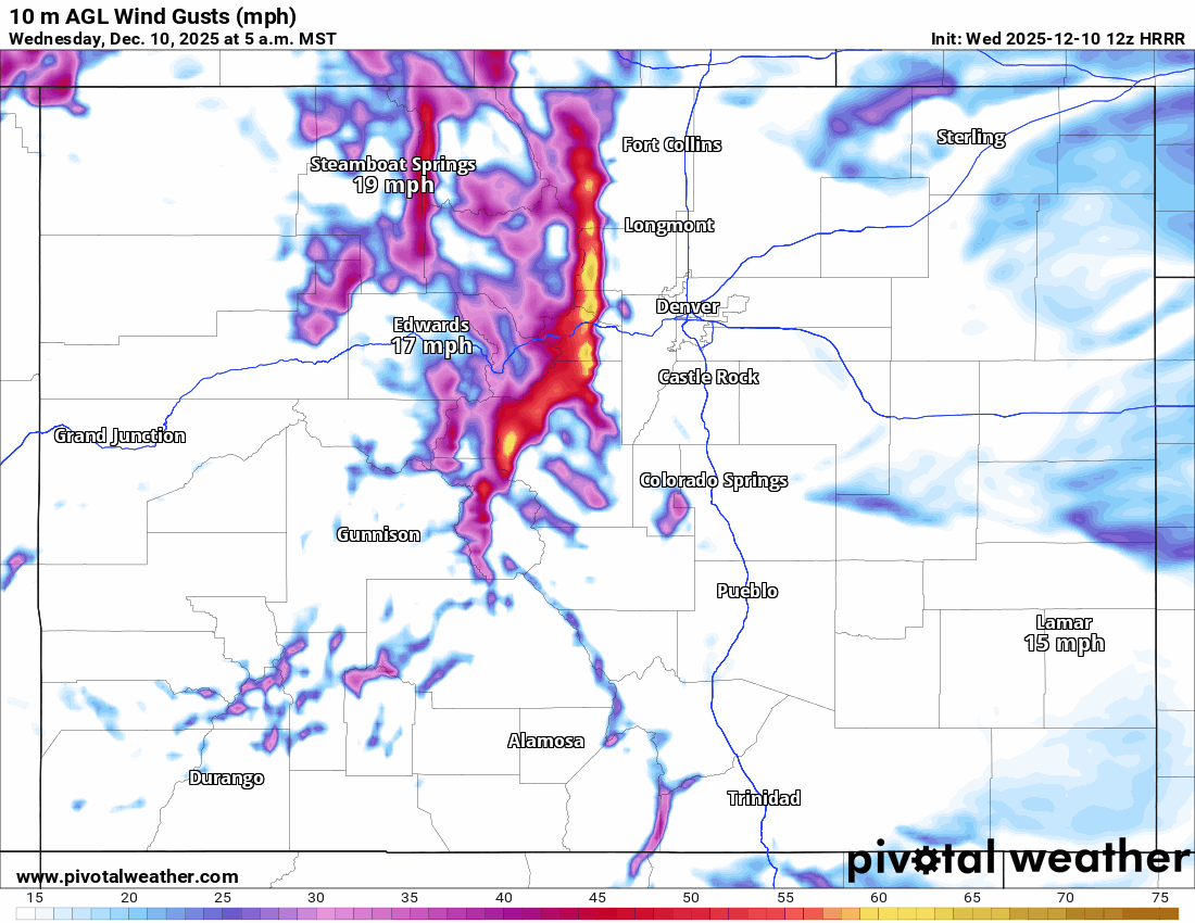 First image is current view of the Loveland snow-stake. Second image shows the current High Wind Warnings from NWS. Third image loop shows forecast wind-gusts over the next 48hrs (5am this morning to 5am Fri). Fourth image shows the cold-front moving into the front-range on early Fri am.