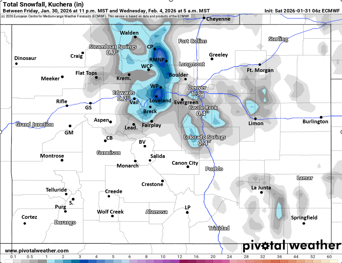 For Den/Bou and the northern front-range a stronger cold-front will move in from the north on Tue afternoon / evening. Then a chance for some snow-showers / light snow mostly from 8pm Tue to 5am Wed. Trace-2" in a few spots, favoring the Palmer Divide and foothills west/southwest of Denver (likely not that much for Den/Bou proper) but will be chilly on Tue evening into Wed (20s and 30s).