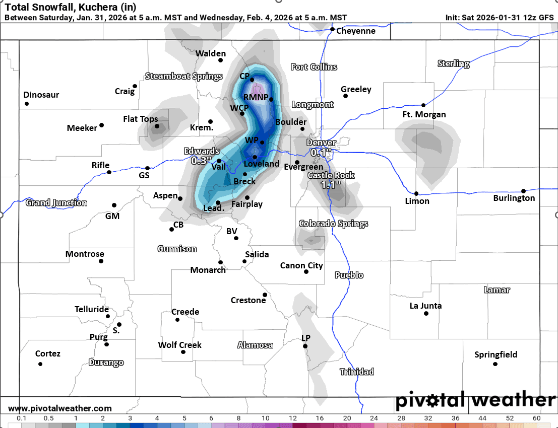For the north-central mountains next round of light snow / snow-showers expected from 11am Tue to 11am Wed: 1-4" of new snow, favoring the Front Range mountains (near Cont. Divide), Loveland Pass, Berthoud Pass, WP, IPW, RMNP, Cameron Pass etc