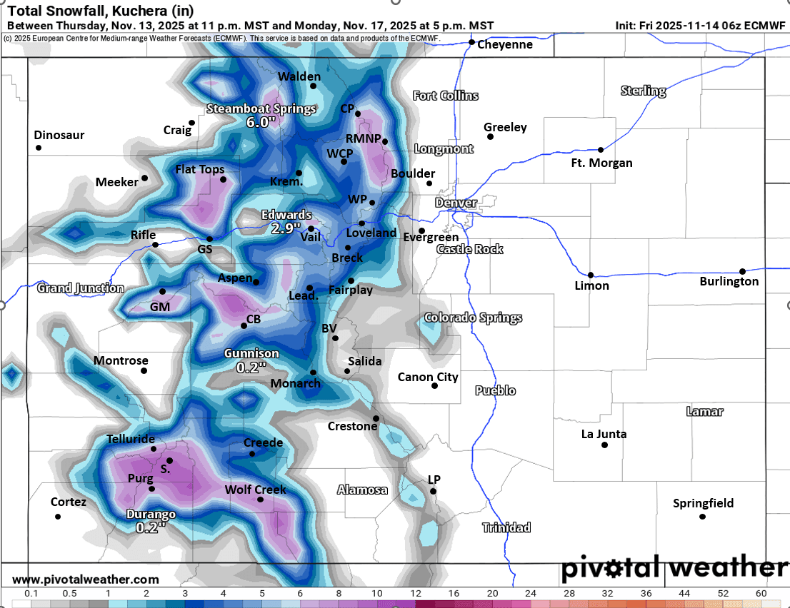 Looking ahead, models are all over the place for next week's storm system between Tue-Thu (11/18-11/20) latest model runs now show the main low tracking too far south for any big impacts and not looking great for snowfall in Den/Bou now at least for that storm (we may have to wait until closer to Thanksgiving)