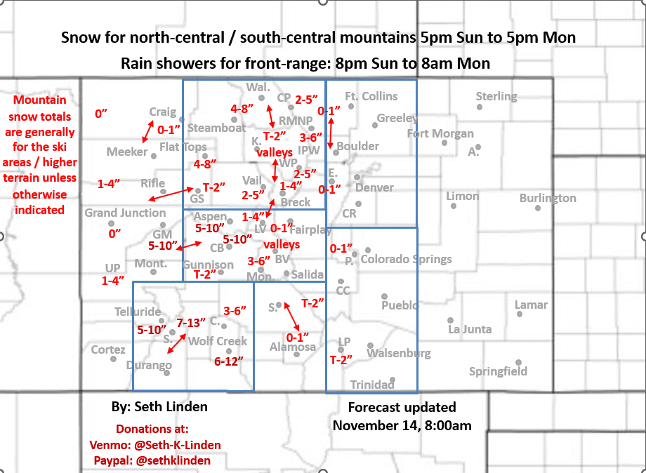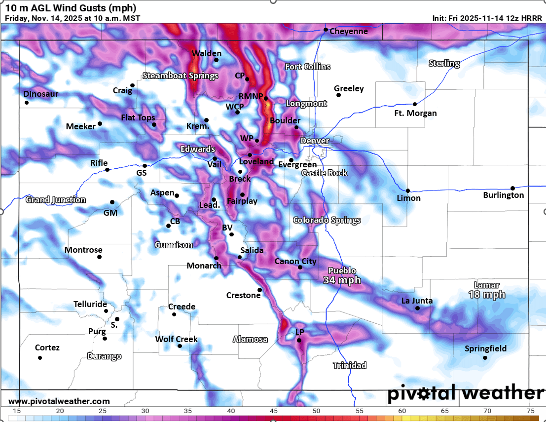 11/14/25 8:45am: Morning, happy Friday. Warm and windy out there this morning along the front-range, already 67 degs at my house on Nov 14th at 8:30am...its warm. Another warm day on tap with some wind. But we do have some changes on the way with a storm system still on tap to impact the state from mid-day Sun through Mon evening.