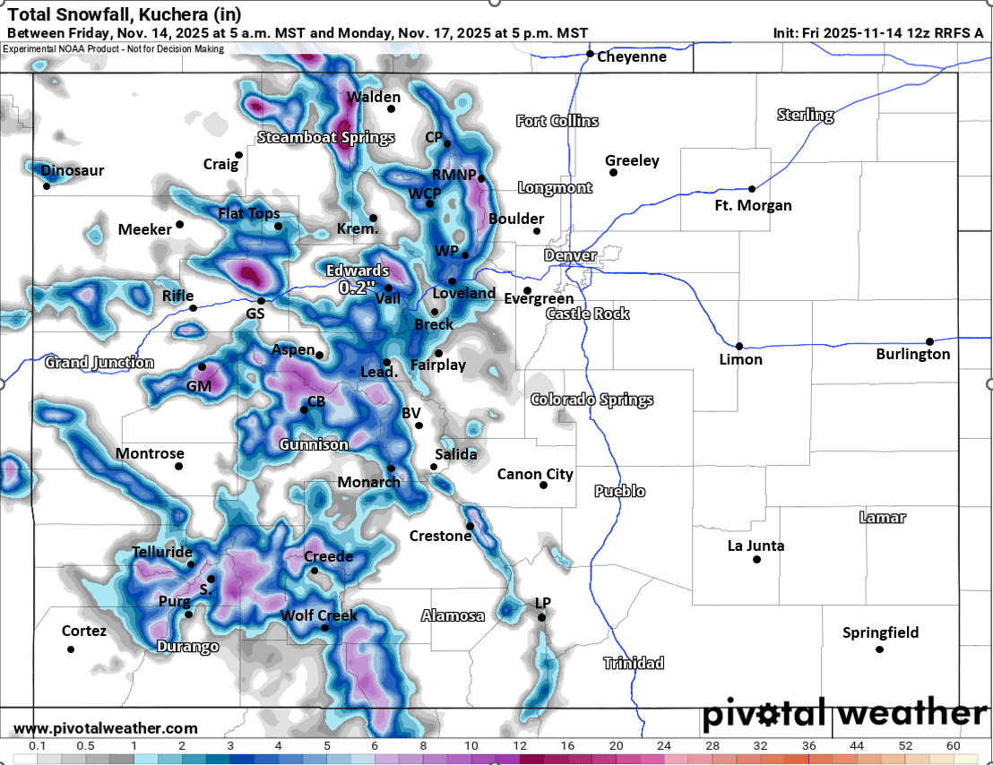 I had some time last night and this morning to make a snowfall map for you (see below). Now, my current confidence in the numbers is not great, due to the fact that the models show more of a split system as it moves across CO...this typically leads to bit less energy / precip in spots and uncertainty in where the heaviest snow will fall. Below is my best guess based on latest model data. As we move toward Sat and Sun we will get in range of the more high-res models (although I did include the lates RRFS, which will replace the NAM soon)