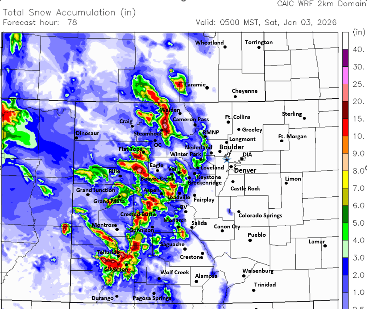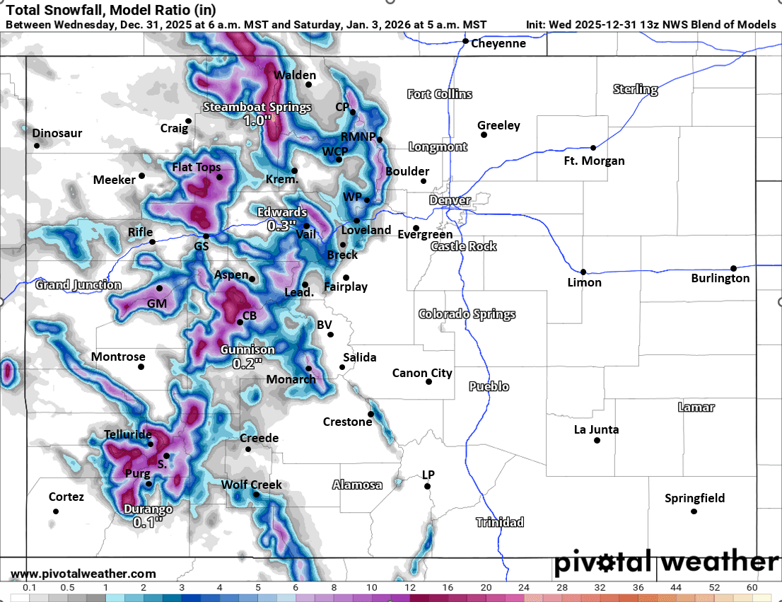 12/31/25 10am: Morning, happy New Year's Eve. We are getting ready to head to the mountain house in Silverthorne soon but I made a snowfall map for the Thu/Fri storm system. I'll let the map mostly speak for itself. Some main points