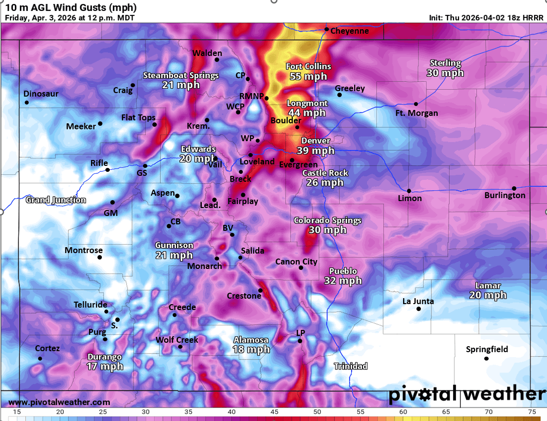 For the Front Range mountains, foothills and urban corridor including Den/Bou, strong wind expected from 9am-6pm tomorrow with west/northwest wind-gusts of 40-80 mph, strongest in the northern foothills of Boulder and Larimer counties above 8k ft, thing Peak to Peak Hwy.