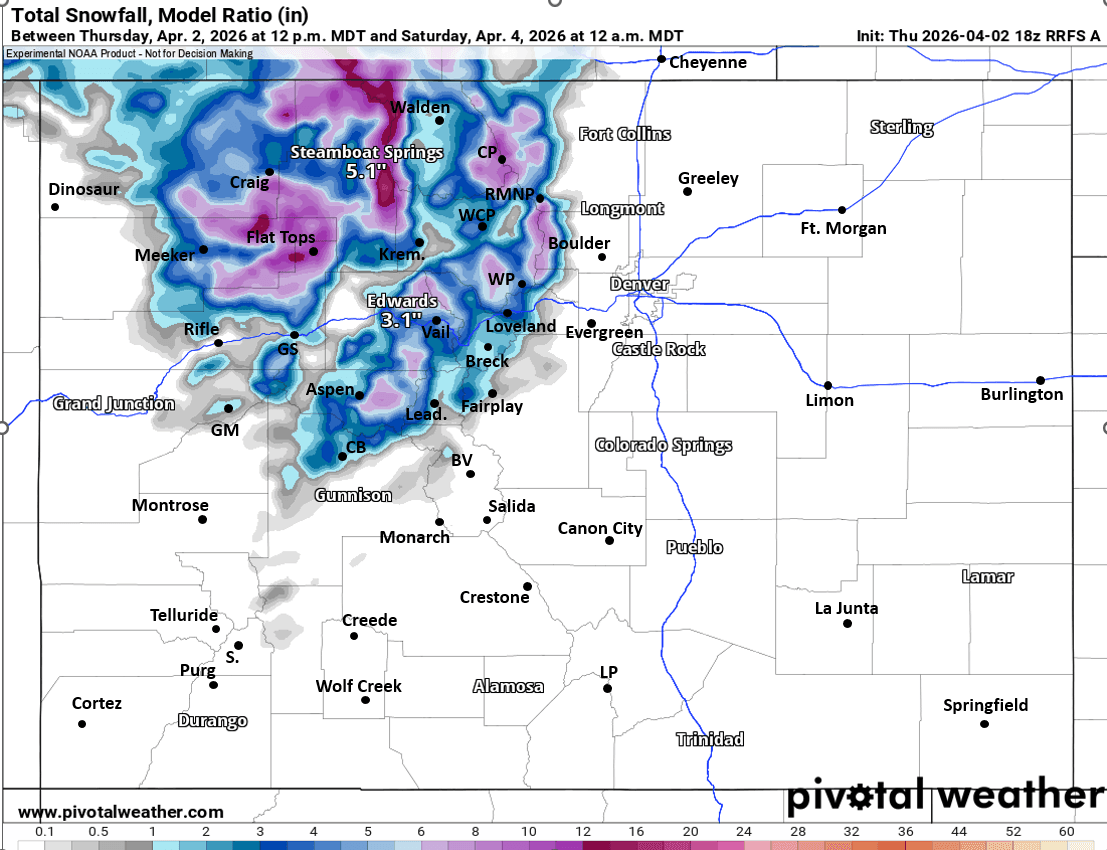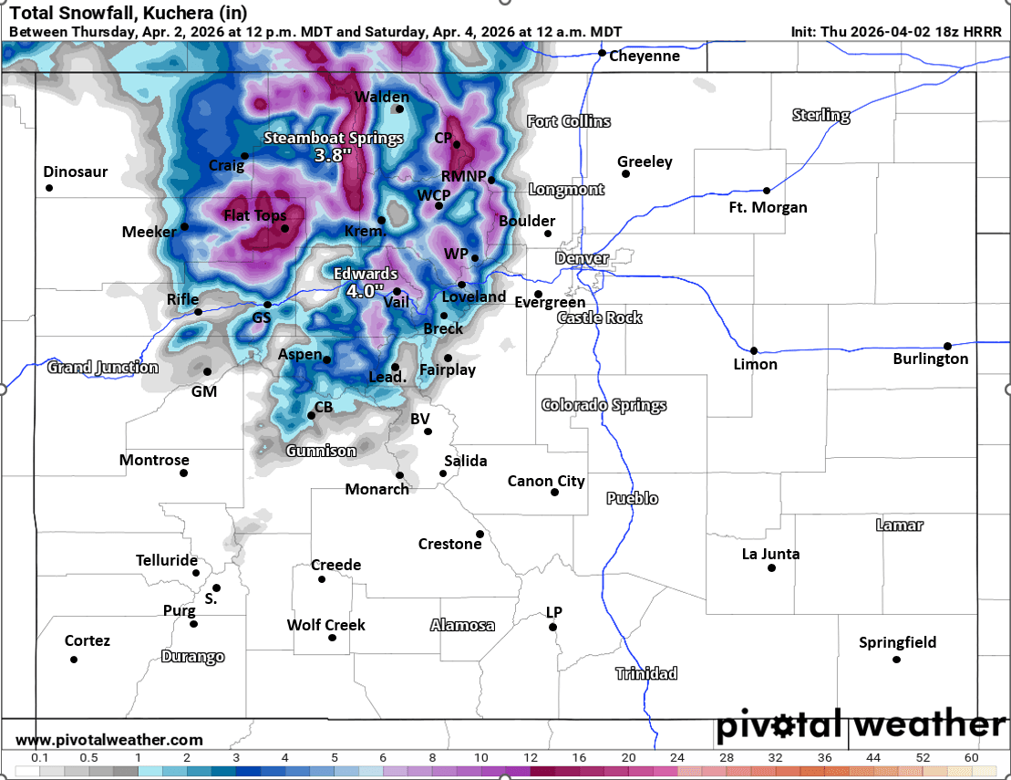 Overall heaviest snow amounts will be in the Park Range (near/north of Steamboat ski area, Rabbit Ears and the Flat Tops): 6-12" for those areas