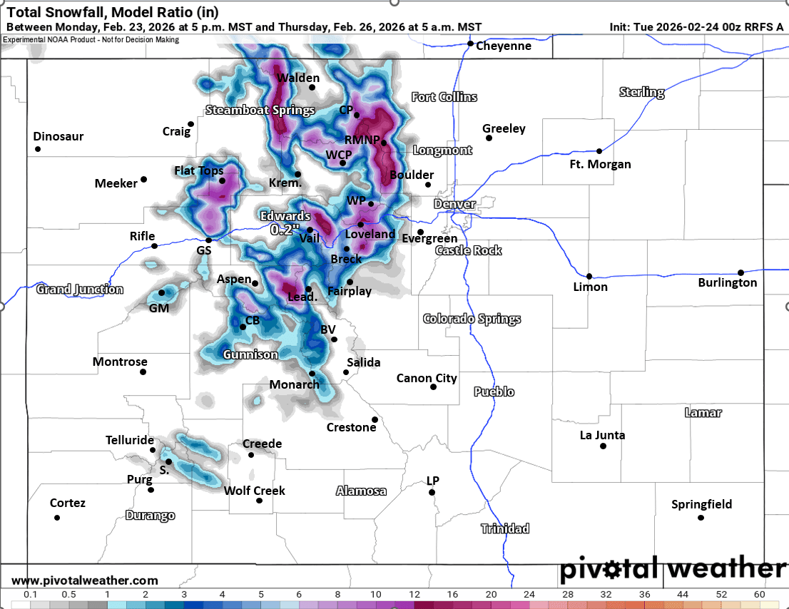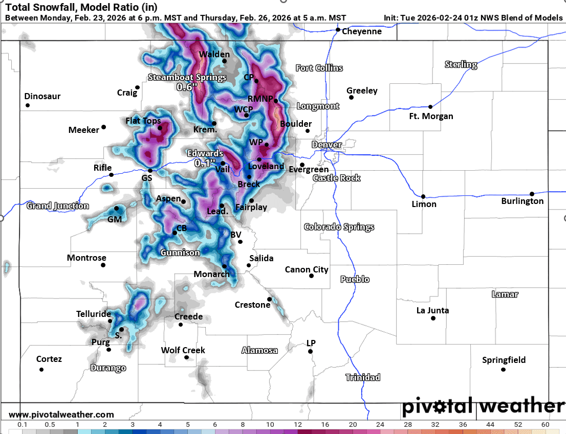 02/23/26 8:30pm: Alright, snowfall map for the Tue night to Thu am storm and a heads up about two active weather days: very strong wind expected tomorrow across the mountains and parts of the front-range and then some decent snowfall for the north-central mountains from Tue night to Thu am.