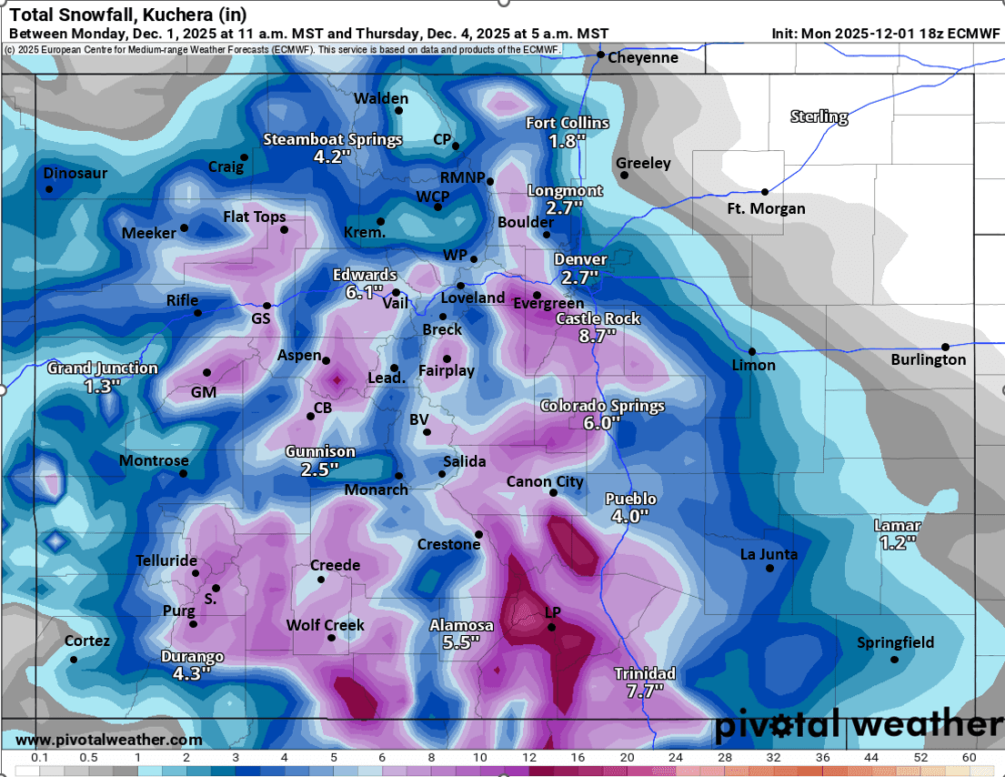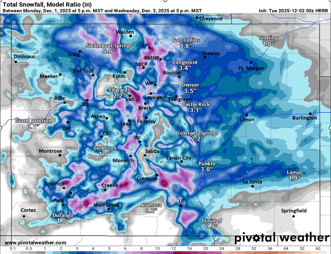 Ft. Collins / Loveland / Greeley areas are a bit more of a wildcard as some models show more up there, some less, likely 1-4" there