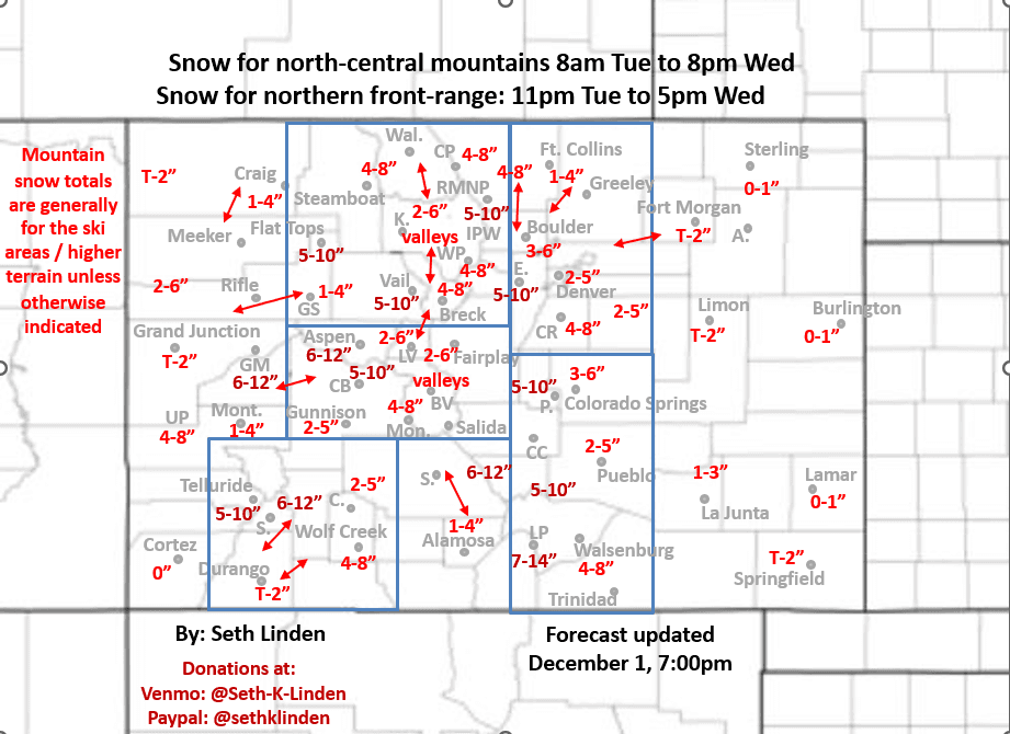 Overall heaviest snowfall again looks to be in parts of the Elk Range (between CB and Aspen), parts of the western San Juans and also parts of the Sangre De Cristos (could be > 12" in spots) on Wed night.