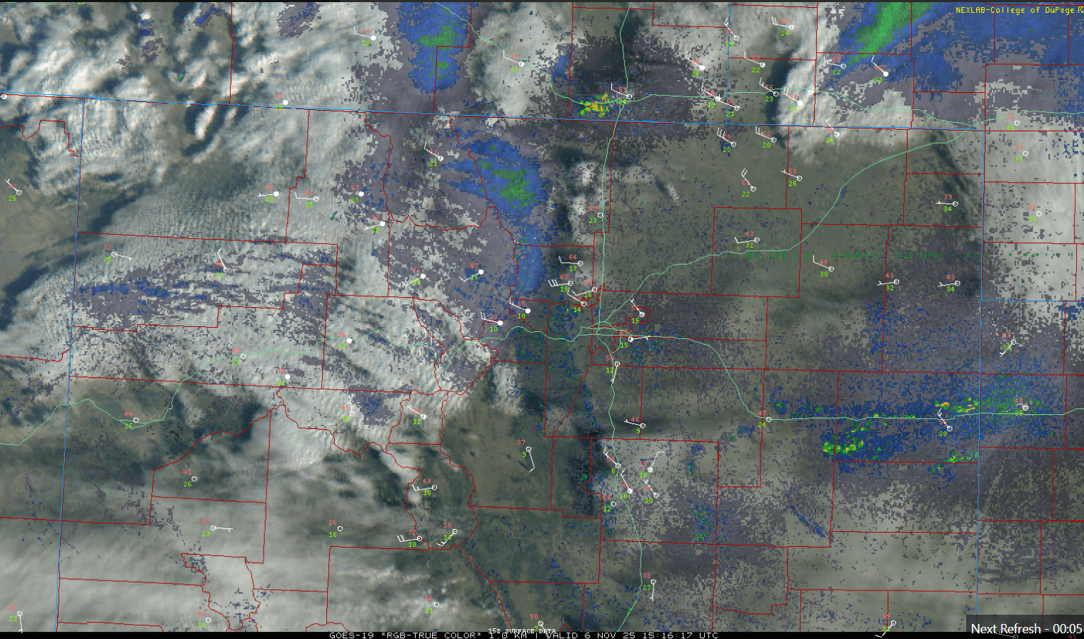 Latest satellite/radar overlay (image 2) shows some snow-showers already moving into the northern mountains closer to Cameron Pass and RMNP now. Also some strong wind already developing in the front-range foothills and western urban corridor (getting windy at my house).