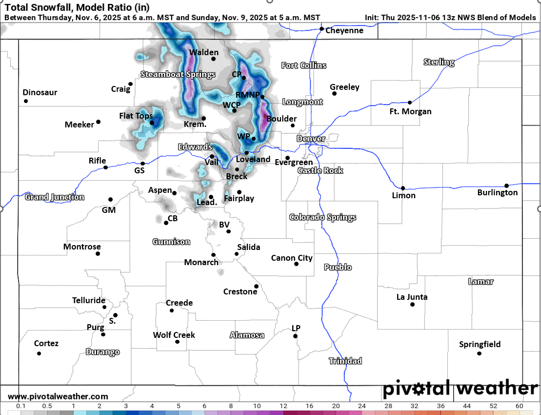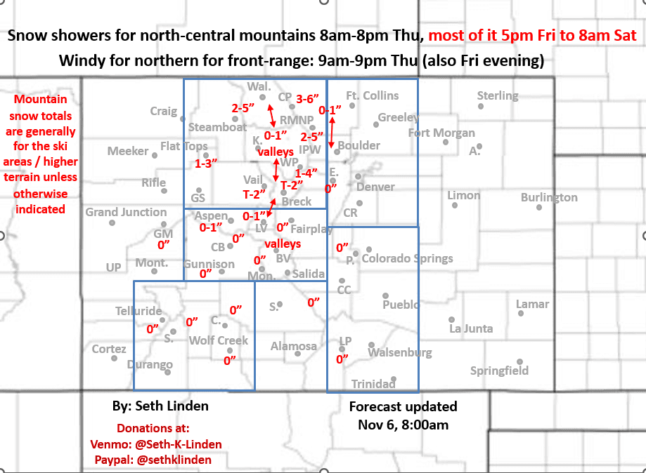 Snowfall map through Sat am (two waves of snow for northern mountains). Windy on the front-range