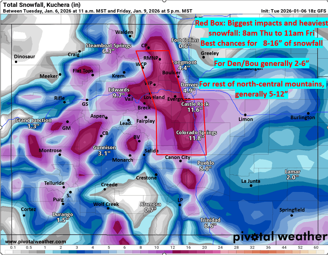 Most of the impacts for the front-range (Den/Bou/Ft.Collins, Springs, Pueblo, etc) will be from 11am Thu to 11am Fri