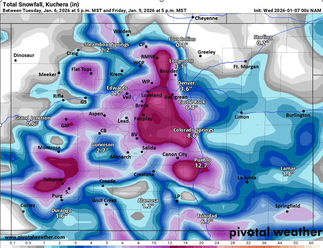 Highest totals in the mountains will be along/east of the Cont. Divide: So areas like Loveland, Berthoud, Winter Park, IPW, RMNP, etc may get 7-14" of new snow.