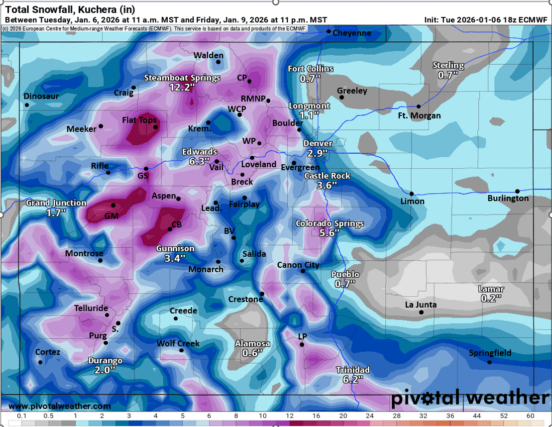 Also looks like much of the Elk Range (Aspen, CB) and western and eastern San Juans (Silverton to Wolf Creek) will get at least 5-10" of snow as well (maybe > 12" in the Elk Range)