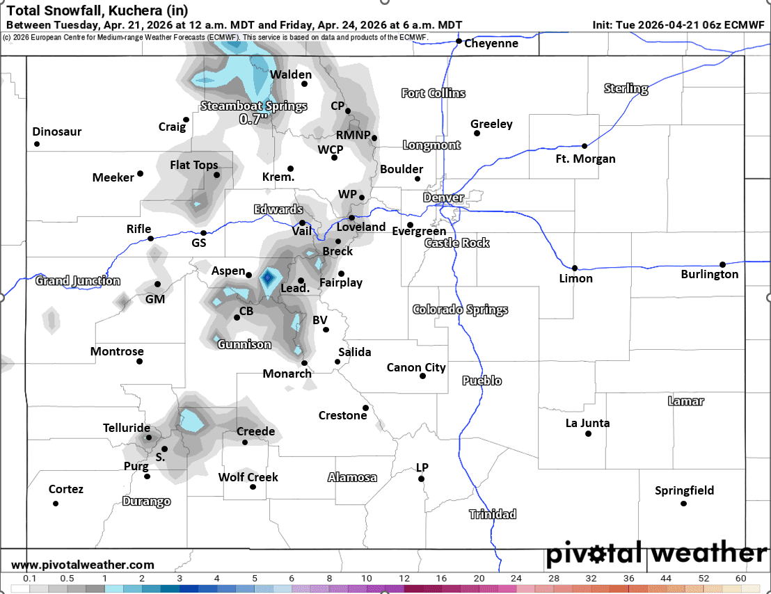 But then some rain/snow showers (snow mostly above 9k ft) move into the mountains during the day Thu, best chances from 12pm-11pm Thu. Models show a chance for 1/2" to 2" of snow in a few spots near the Cont. Divide by Fri am.