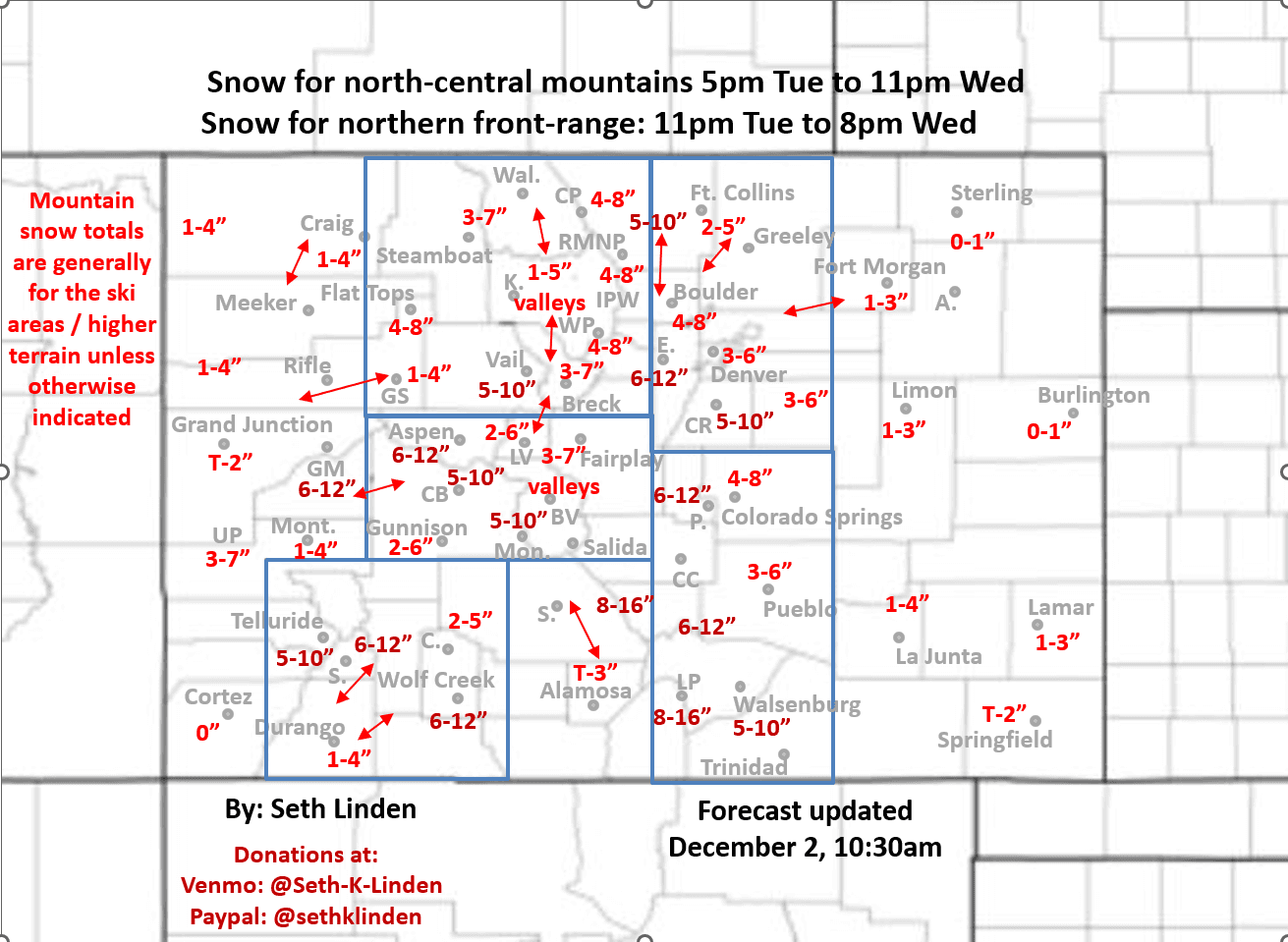 I increased snowfall for Colorado Springs (4-8"), and Pueblo to Trinidad: 3-6" and likely heavy snow for the Sangre De Cristo and Wet Mountains (8-16" fo those areas, above 9k ft).