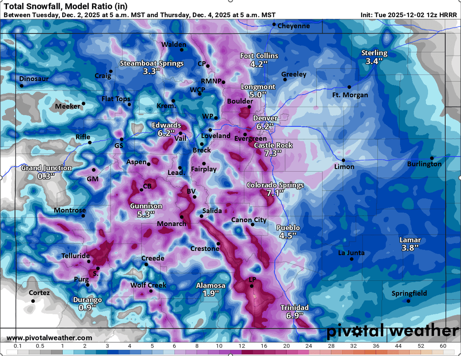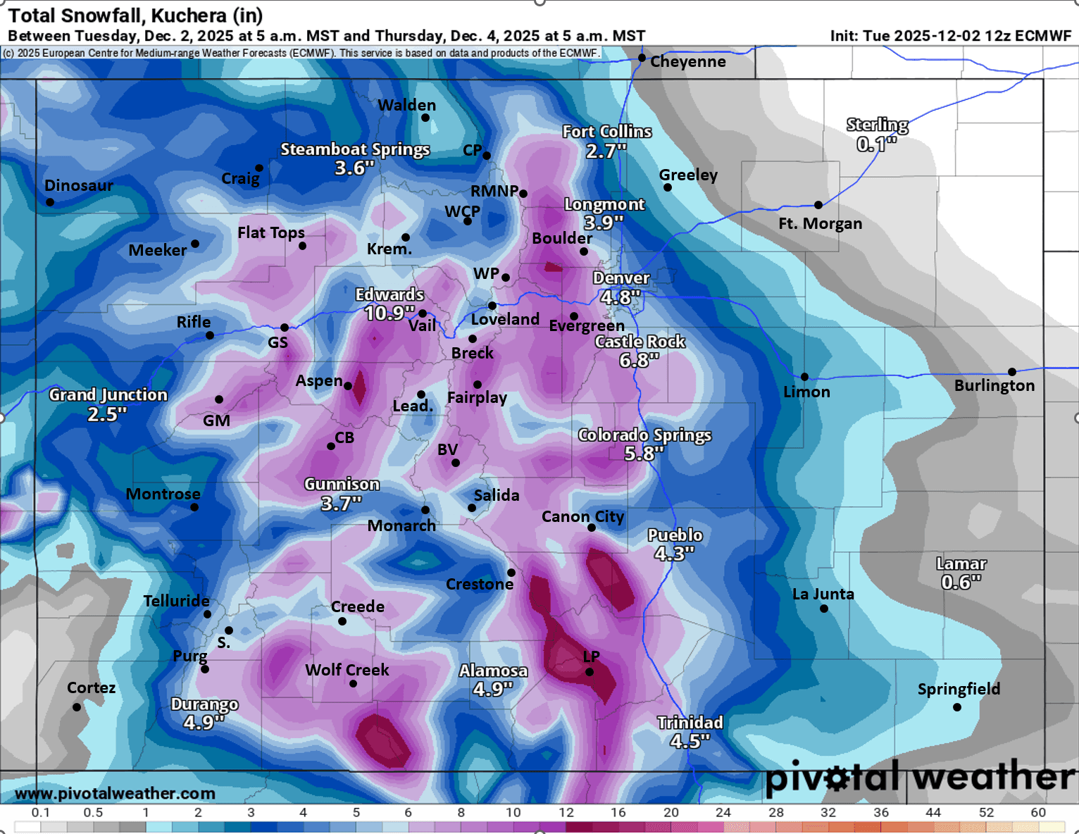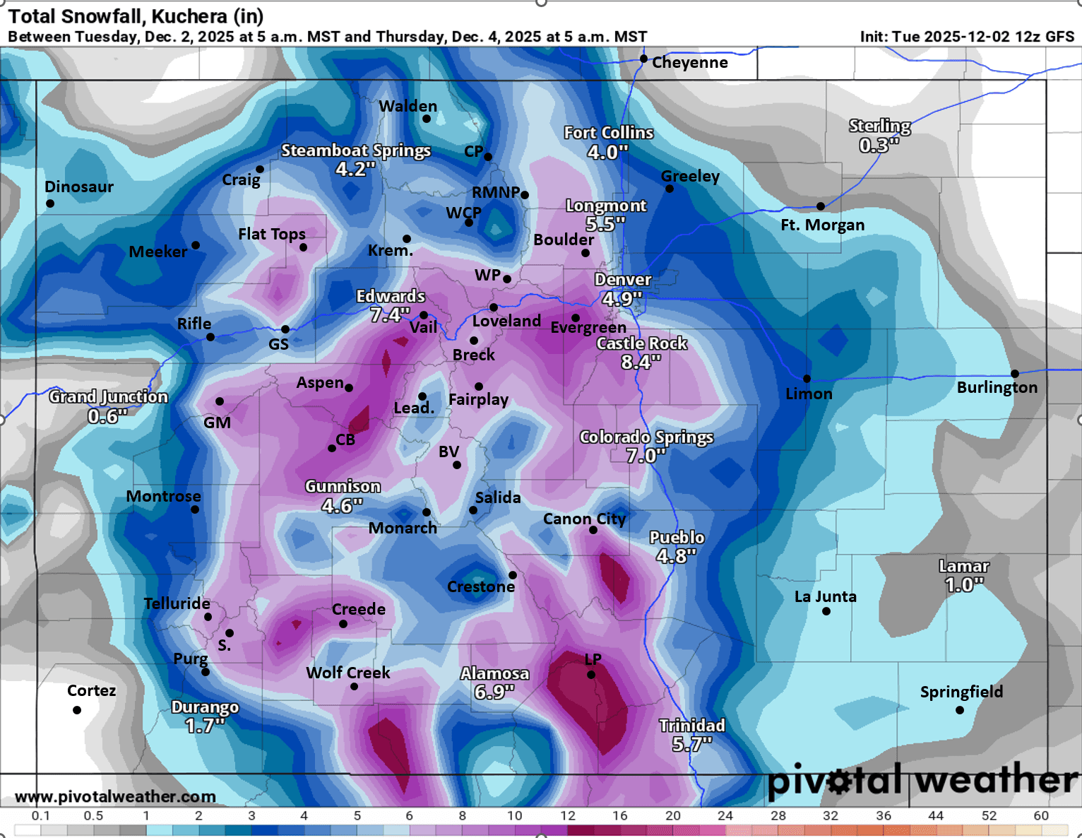 Second half of the event from 11am Wed to 5am Thu will favor southern CO with heavy snow.