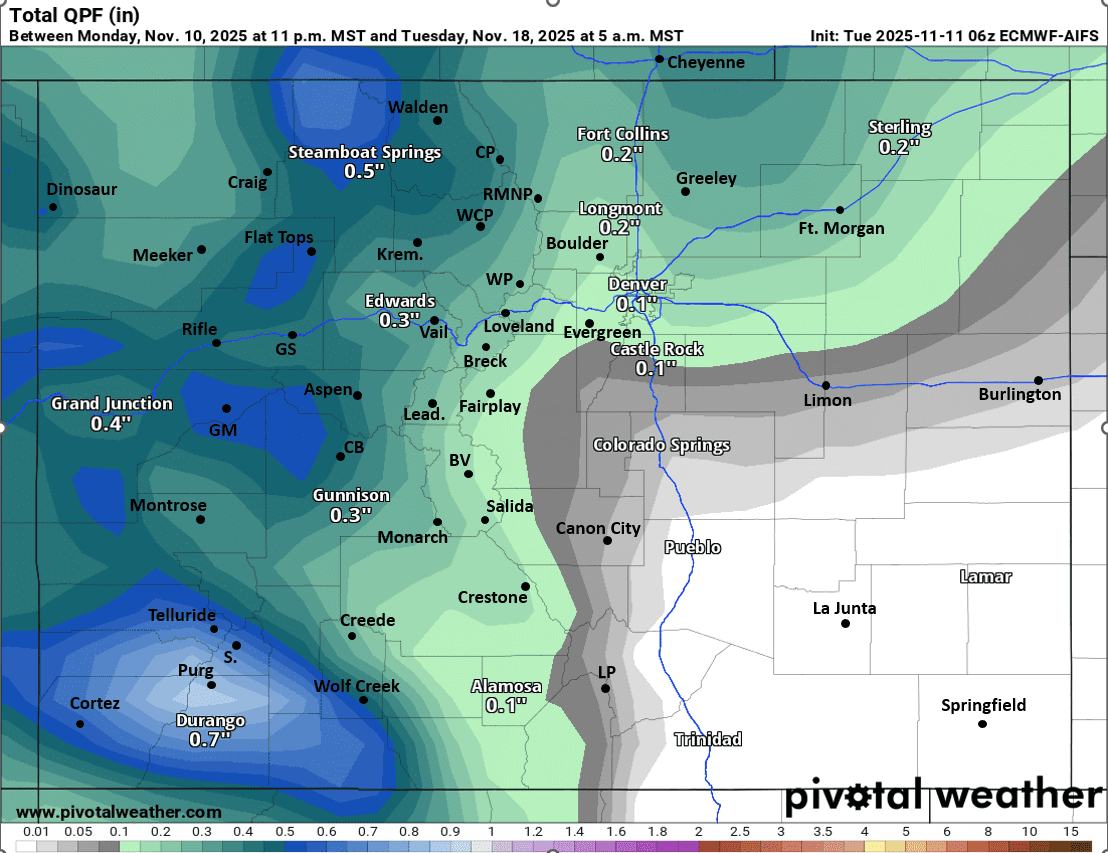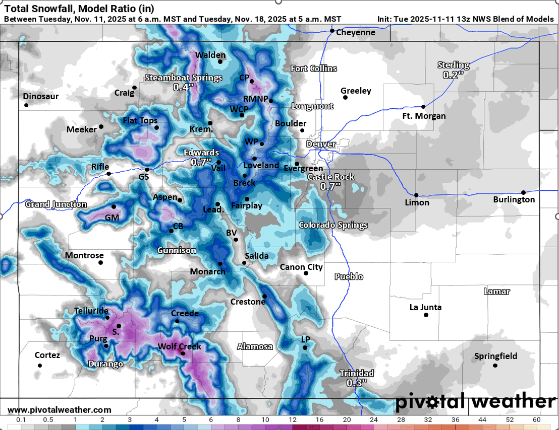 Some snow for north-central mountains and I-70 corridor on Sun into Mon, maybe 3-9" in spots by Mon night but uncertainty is high.