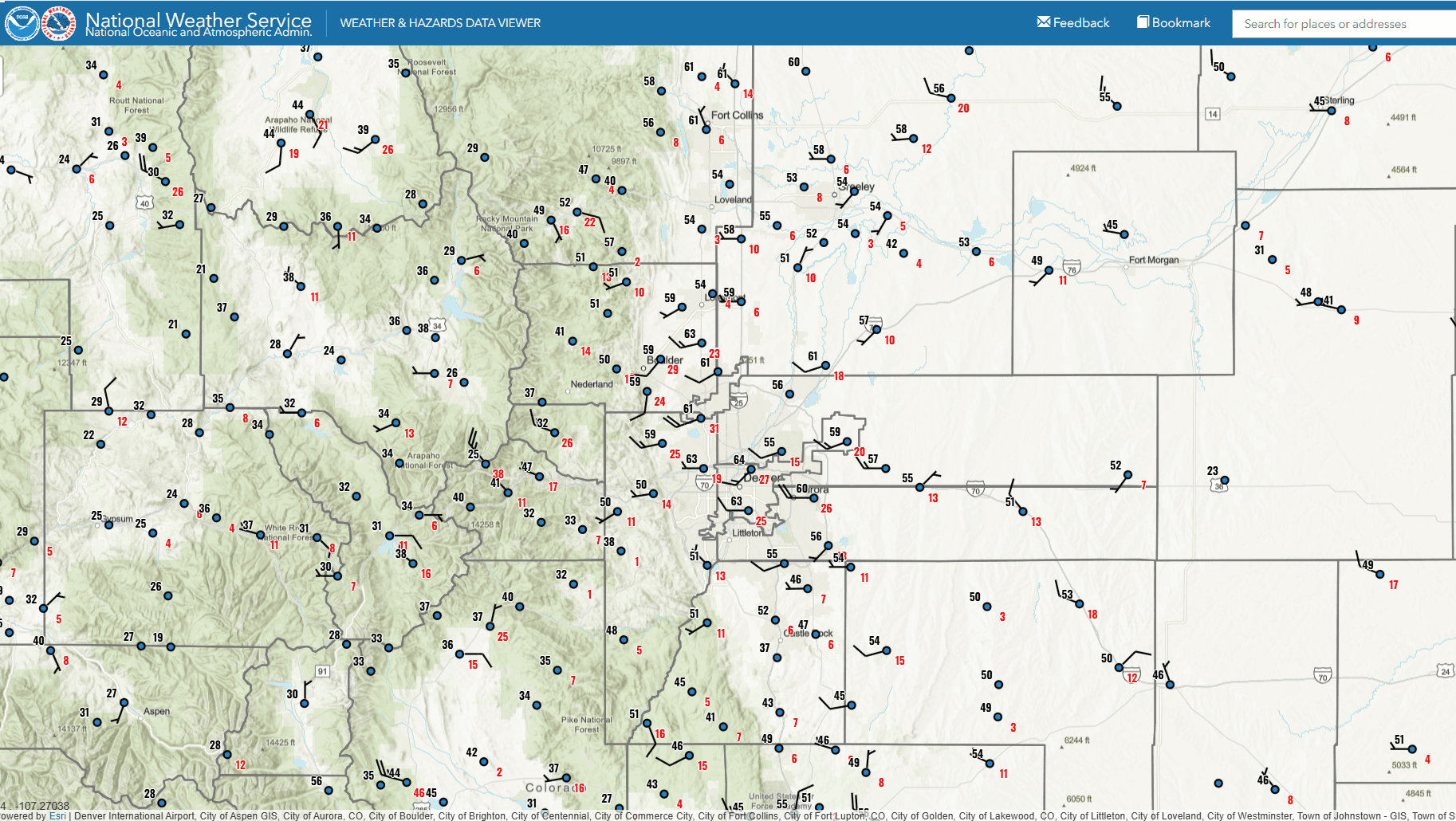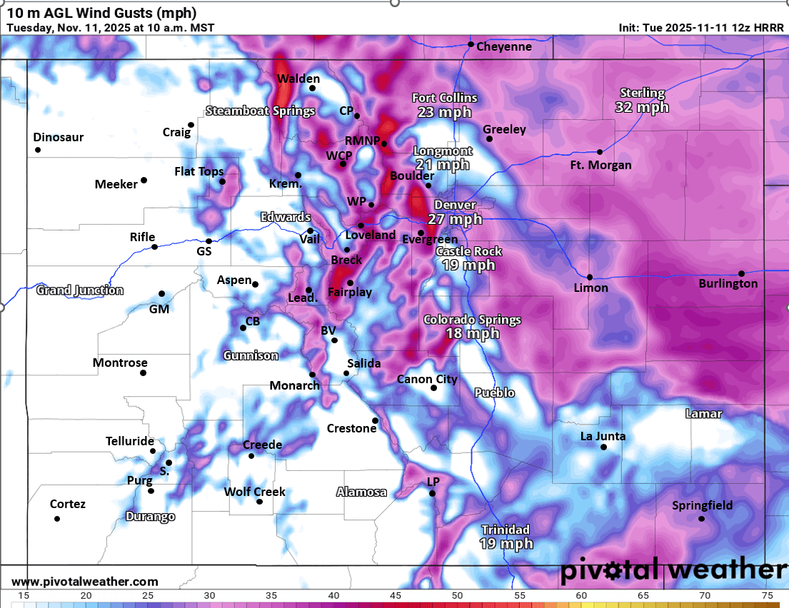 For the rest of today it will be warm and windy over CO. Windy through 5pm with west / southwest wind-gusts of 20-50mph, strongest over the northern Front Range mountains and foothills above 8k ft and also near the CO/WY border and parts of the Palme Divide (second image shows the forecast wind-gusts at 10am today).