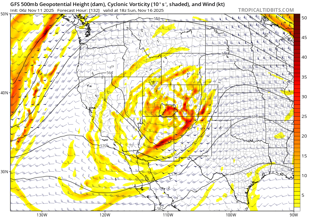 Anyway, in terms of the weekend storm system (meandering upper-level low), the models are all over the place in terms of where the low tracks as it moves east on Sun into Mon. Latest GFS has it moving up across the state from southwest to northeast and this would bring a bigger shot of rain/snow to the mountains and front-range. ECMWF and GEM to some degree keep it further south and weaker with more limited impacts.